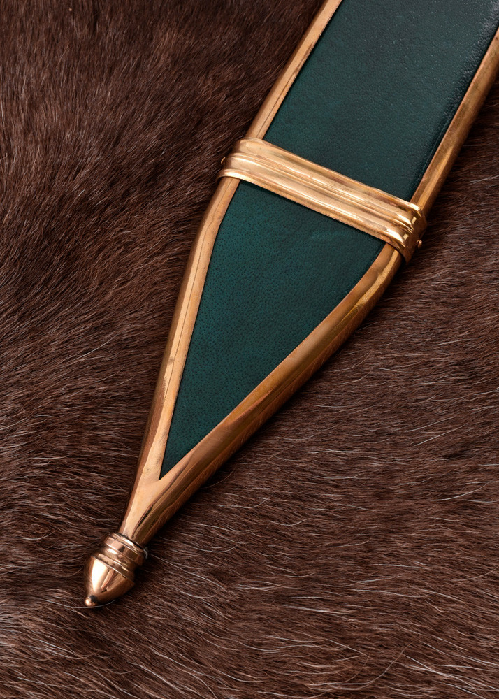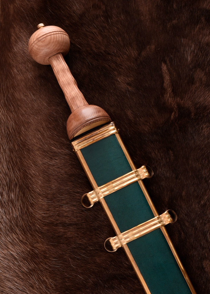 Não se trata apenas de possuir uma peça, mas de incorporar uma história, de sentir que cada desafio enfrentado está inspirado na épica da Roma antiga. A qualidade do aço EN45 na lâmina garante durabilidade, enquanto o seu design inspirado nas variações históricas do gladius coloca-o numa batalha real, na arena da história. Esta espada reflete não só resistência, mas também conforto e versatilidade, adaptando-se aos seus momentos de lazer, exibição ou coleção. A bainha de couro e latão não só protege, mas também realça seu sentido de poder e autoridade, dizendo ao mundo que você também pode carregar em suas mãos a força de um império.