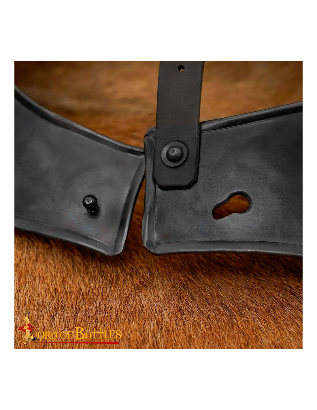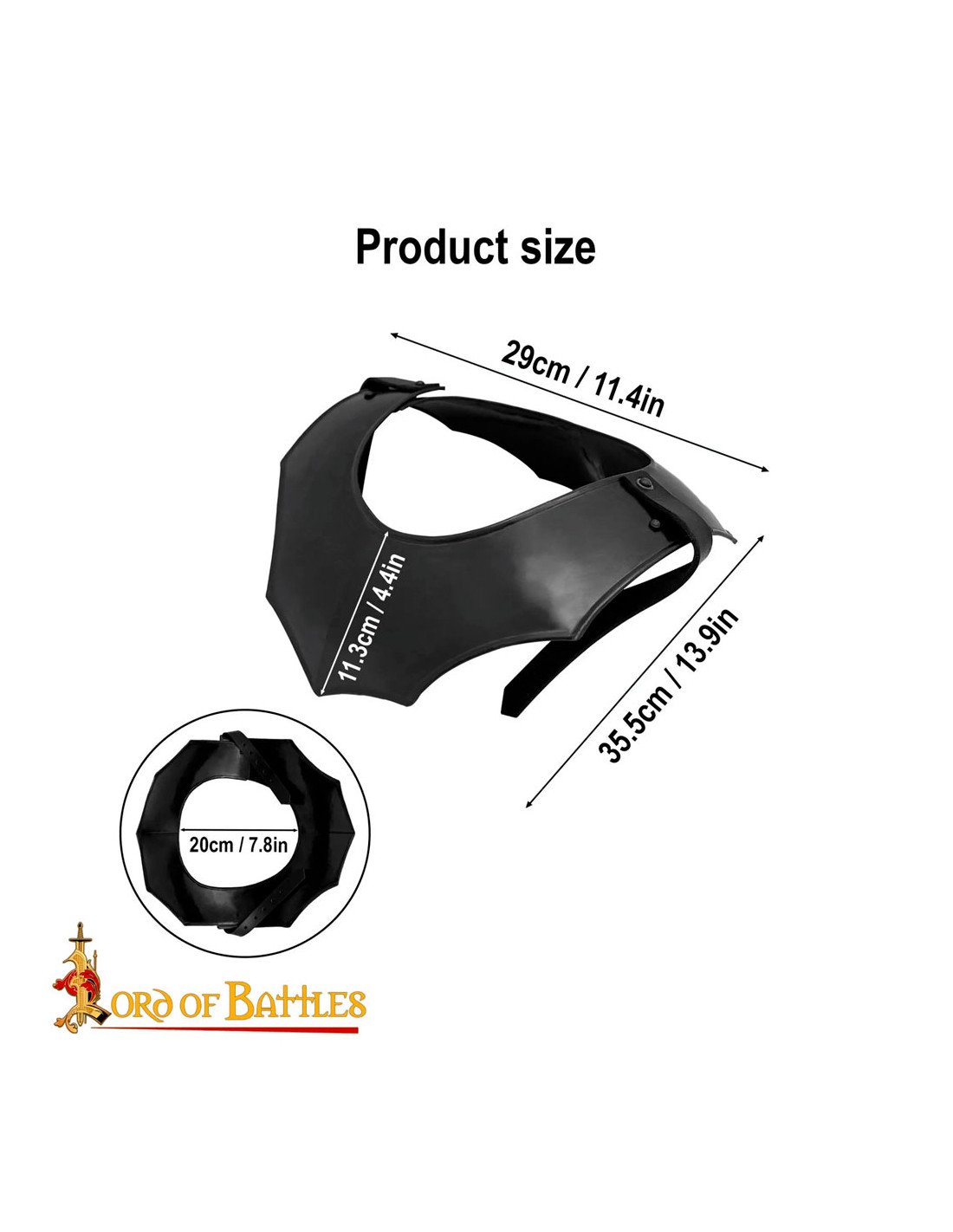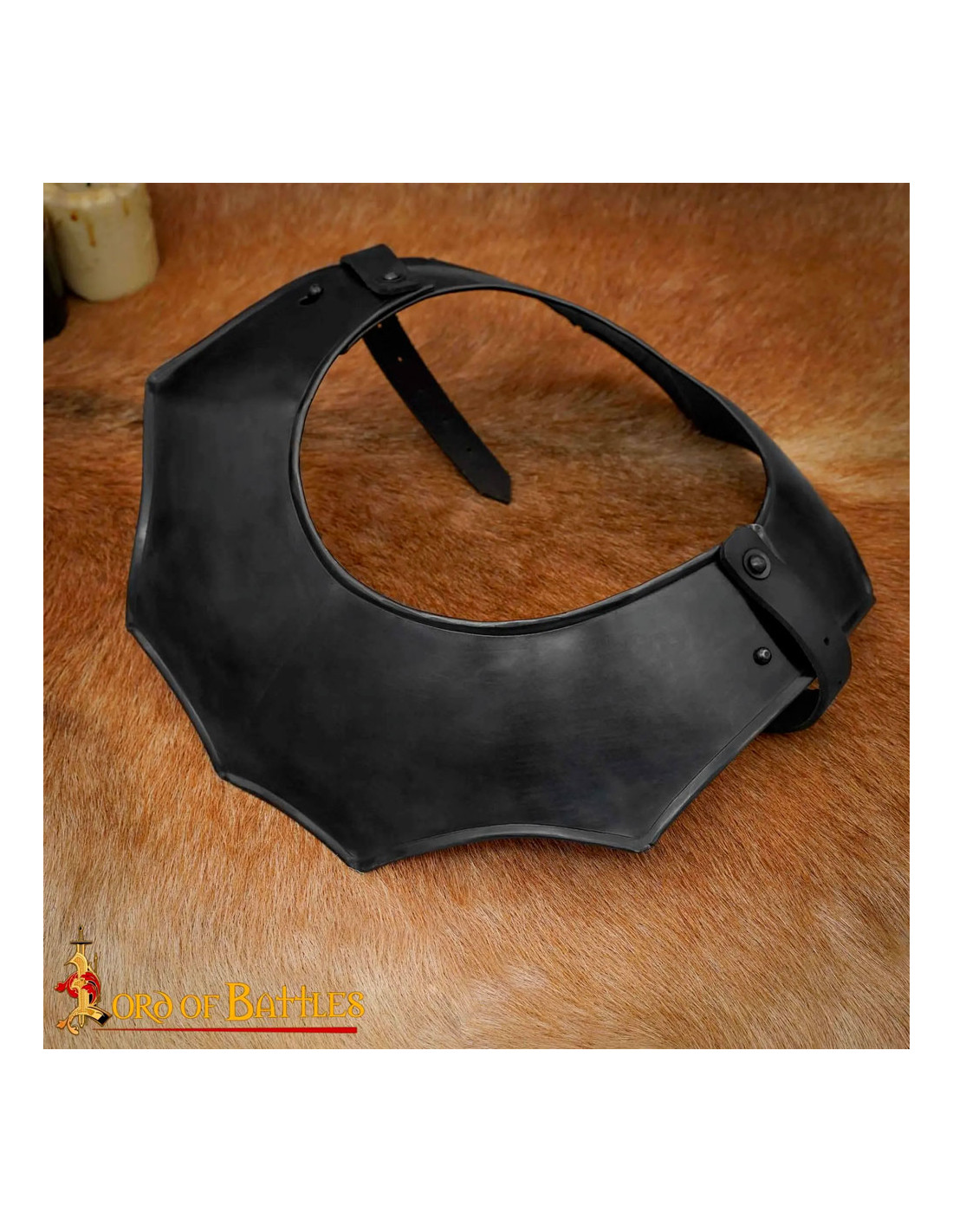 Destaque-se da multidão com o Gorget Medieval Simples com Acabamento Preto. Este acessório impressionante é habilmente trabalhado a partir de aço macio forte de calibre 18, tornando-o o companheiro perfeito para o seu LARP e roupas de reconstituição.