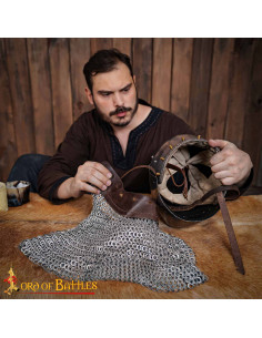Nosso gorget pode ser facilmente preso ao seu elmo bascinet ou a qualquer capacete com vervelles, proporcionando defesa adicional sem sacrificar o conforto. Feito de anéis redondos de aço macio de calibre 18 com diâmetro aproximado de 8 mm, cada anel é meticulosamente rebitado com rebites em forma de cúpula por nossos artesãos qualificados. Este trabalho artesanal garante uma construção forte e durável que pode suportar os rigores do combate.