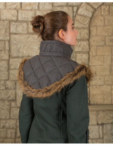 Seu design acolchoado em losangos favorece a flexibilidade, permitindo liberdade de movimento sem abrir mão da proteção. Este gorjal é o complemento ideal para usar sob armaduras de placas ou cota de malha, protegendo seu pescoço e aliviando a pressão das peças de armamento mais pesadas.