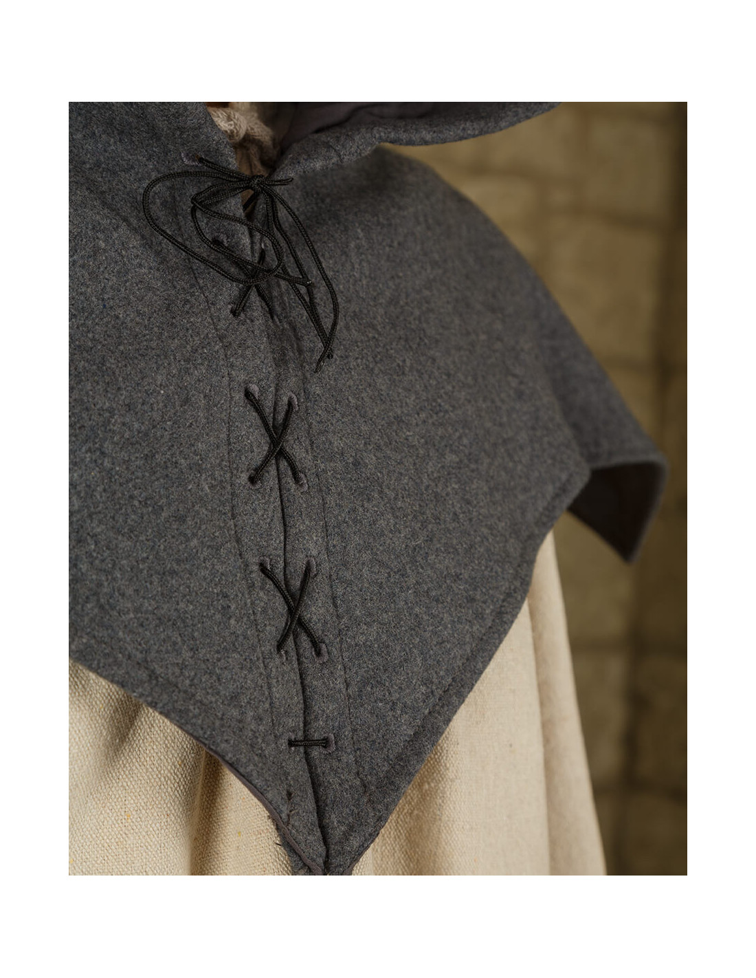 Este capuz redondo e rombudo tem um design simples mas interessante, com bainha curva que cai sobre os ombros e fecha com cordão de algodão. Seu estilo autêntico e a cor cinza clássica fazem dele uma opção versátil que combina com muitos trajes medievais.