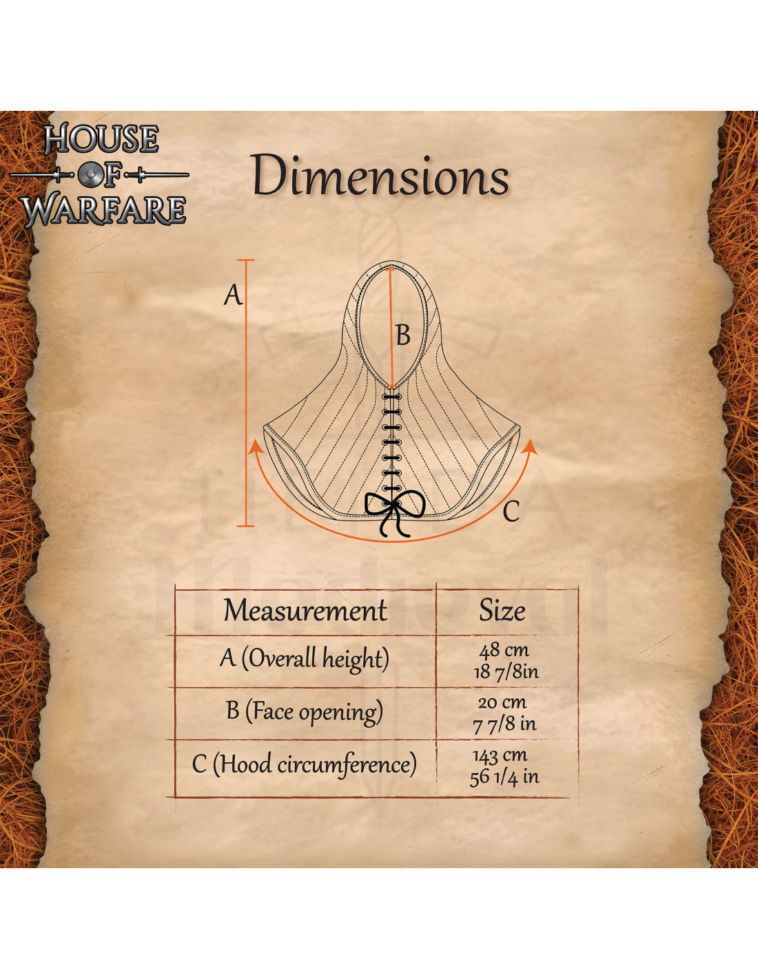 Este item é especialmente valorizado por entusiastas de LARP e por profissionais de teatro e recriação histórica, porque combina estética fiel aos séculos XIII a XV, com funcionalidades pensadas para o uso moderno. Naquela época, capuzes acolchoados como este eram essenciais para amortecer golpes e evitar atritos, um detalhe prático que hoje mantém toda a sua relevância.