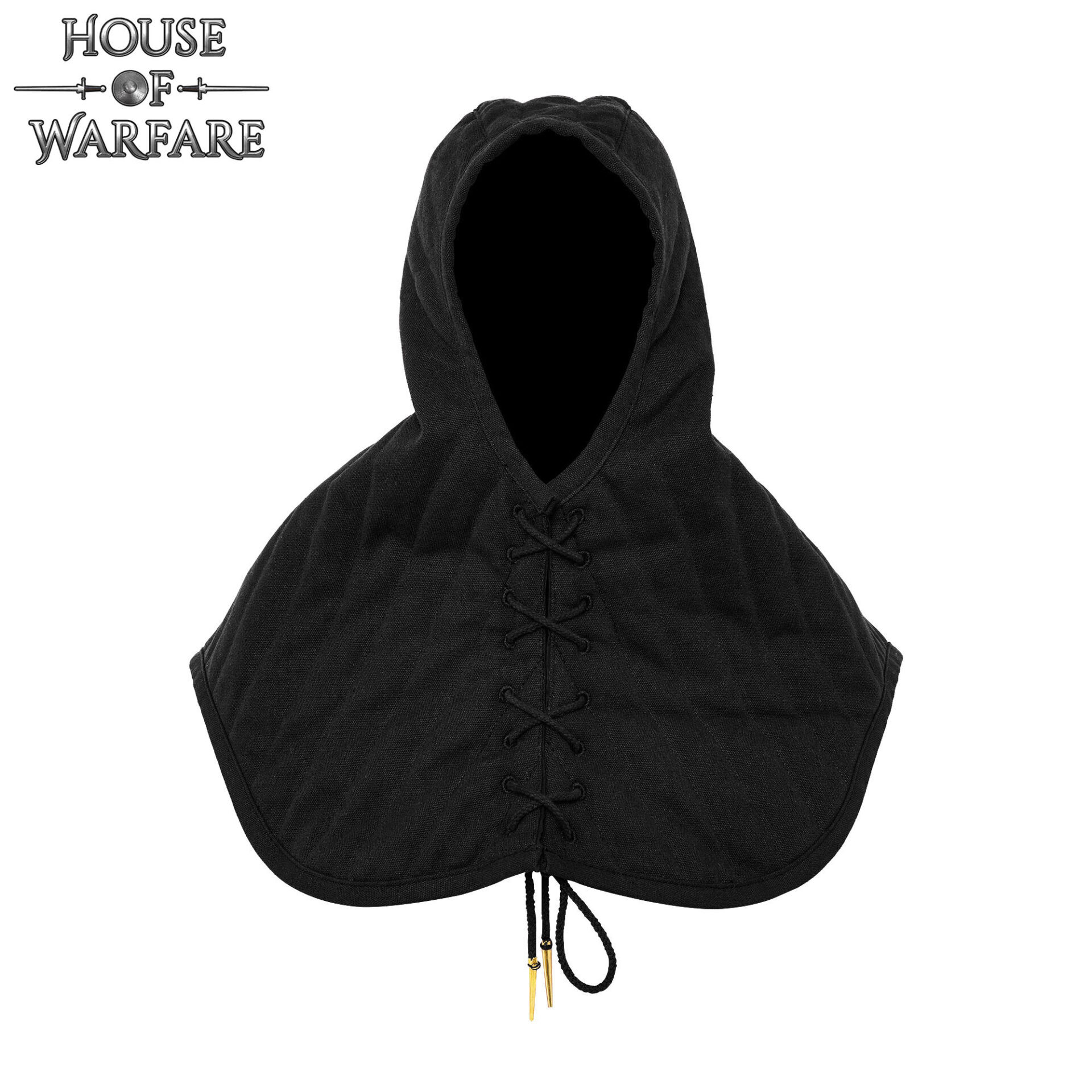 O contorno arredondado se estende sobre os ombros e a parte superior do peito, oferecendo uma cobertura que funciona como uma camada protetora sob capacetes, gambesão ou malhas, mas também como uma peça independente para treino leve ou para completar uma vestimenta histórica com estilo.