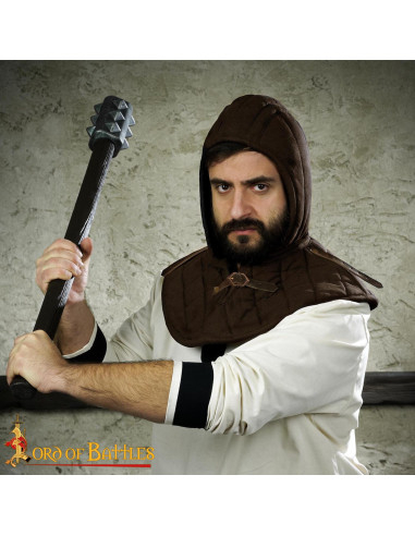 - Aparência histórica em marrom escuro com padrão acolchoado em quadrados, fácil de integrar em qualquer traje medieval.