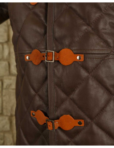 - Fechamento firme com fivelas de latão fundido: O gambeson Haldur fecha no peito com 4 fivelas robustas de latão fundido. Este fecho não só garante um ajuste seguro, mas também adiciona um toque autêntico e robusto ao design geral.