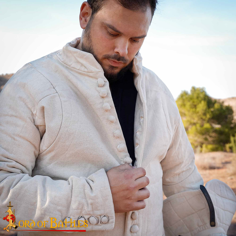 Gambesão medieval acolchoado tipo 6 com frente abotoada, cor natural