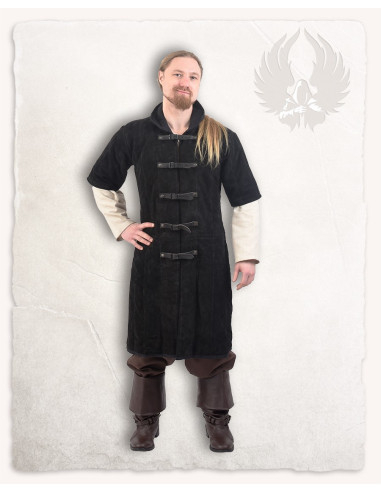 Confeccionado em tecido resistente e acolchoado que amortiza impactos, além de correias de couro que garantem durabilidade, este modelo funciona tanto como base para diferentes montagens de proteção, como uma jaqueta externa de caráter. Sua cor marrom proporciona versatilidade, integrando-se com peças metálicas ou vestuário cotidiano de inspiração histórica.