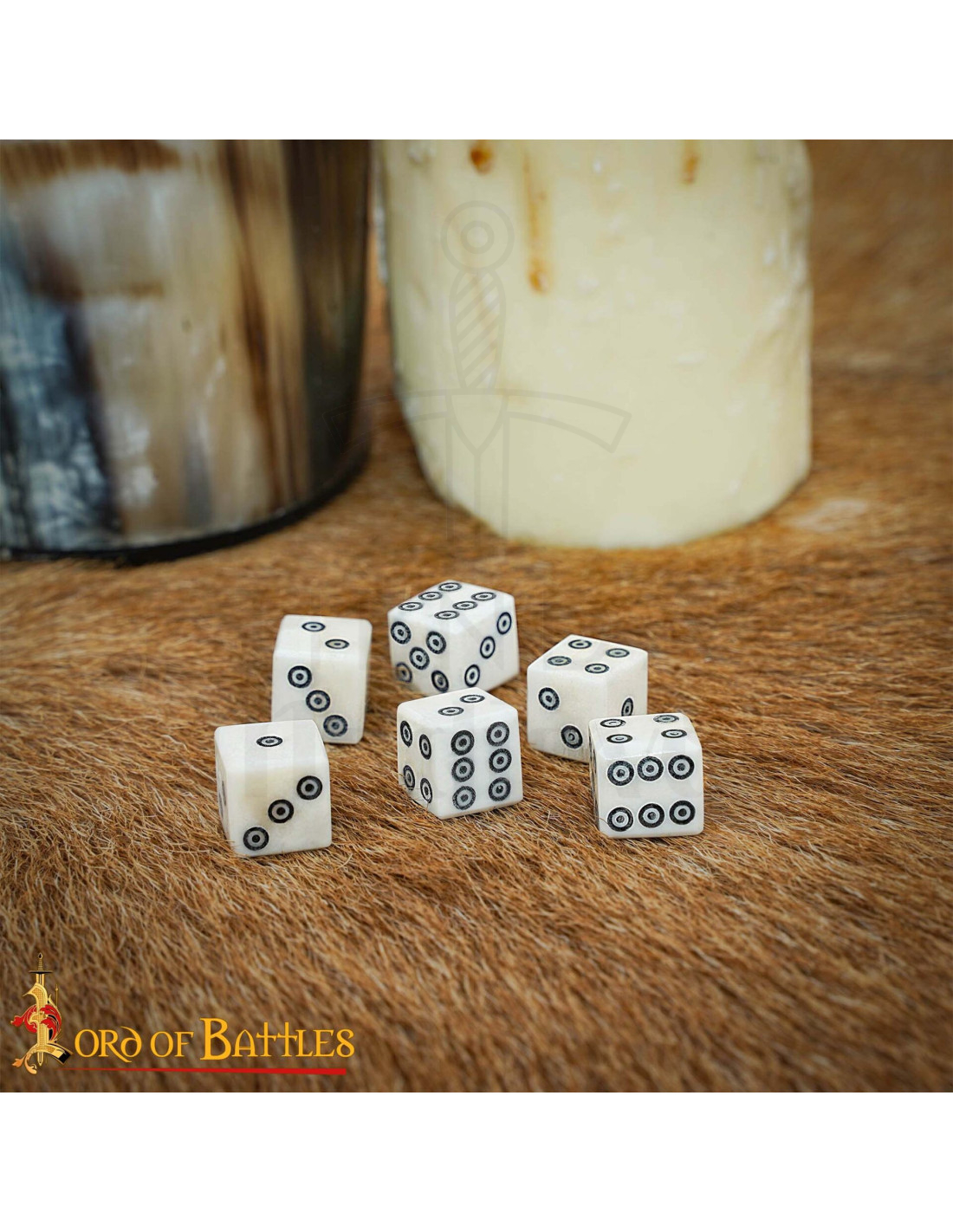 Traga a atmosfera de antigos acampamentos romanos, tavernas medievais ou salões vikings para a sua mesa de jogo com este conjunto artesanal de seis dados de osso, conhecidos como tesserae. Cada um é cuidadosamente formado e polido à mão, oferecendo uma textura sólida e autêntica na mão, com um tom branco off-white e detalhes em pontos pretos que se destacam com clareza.