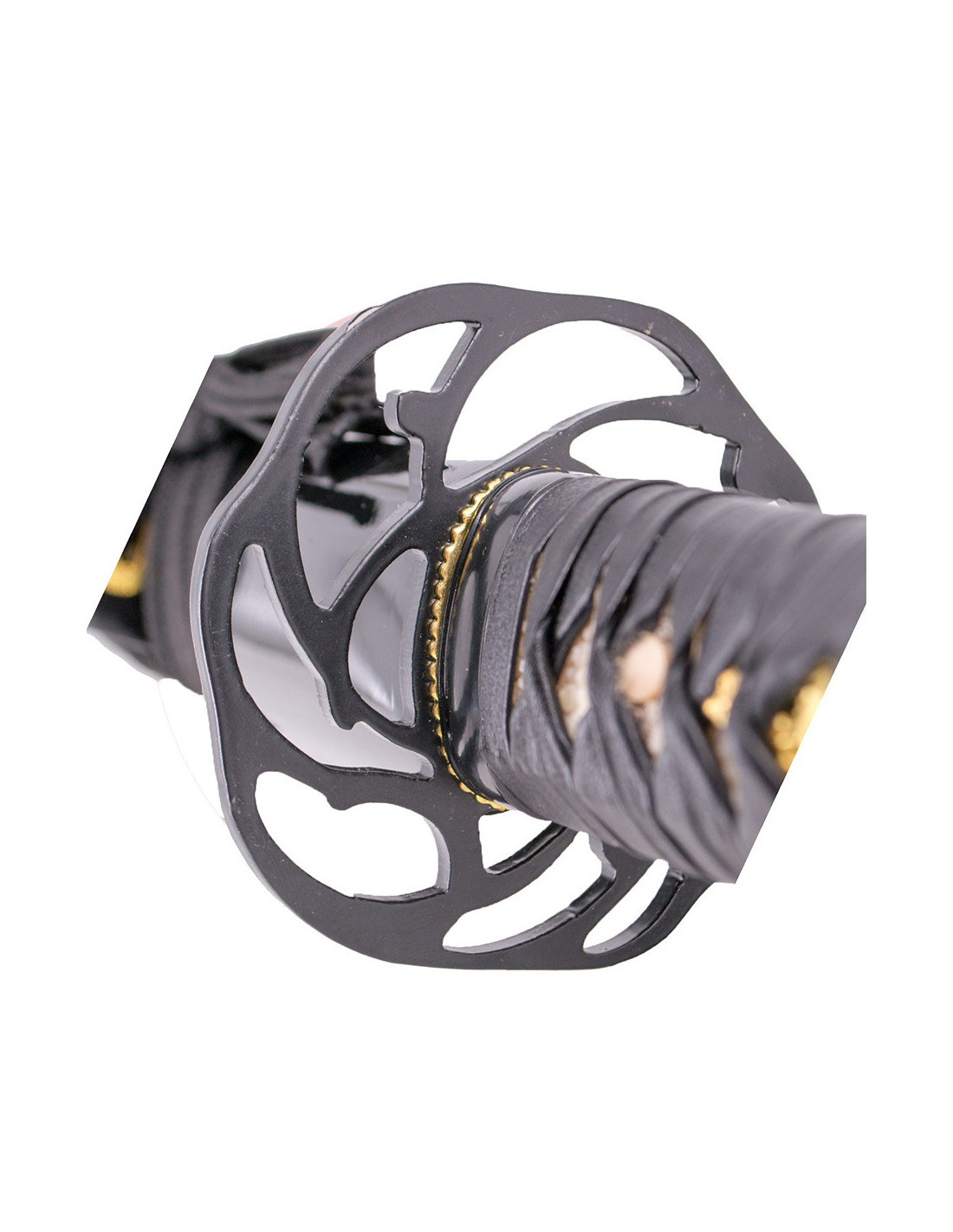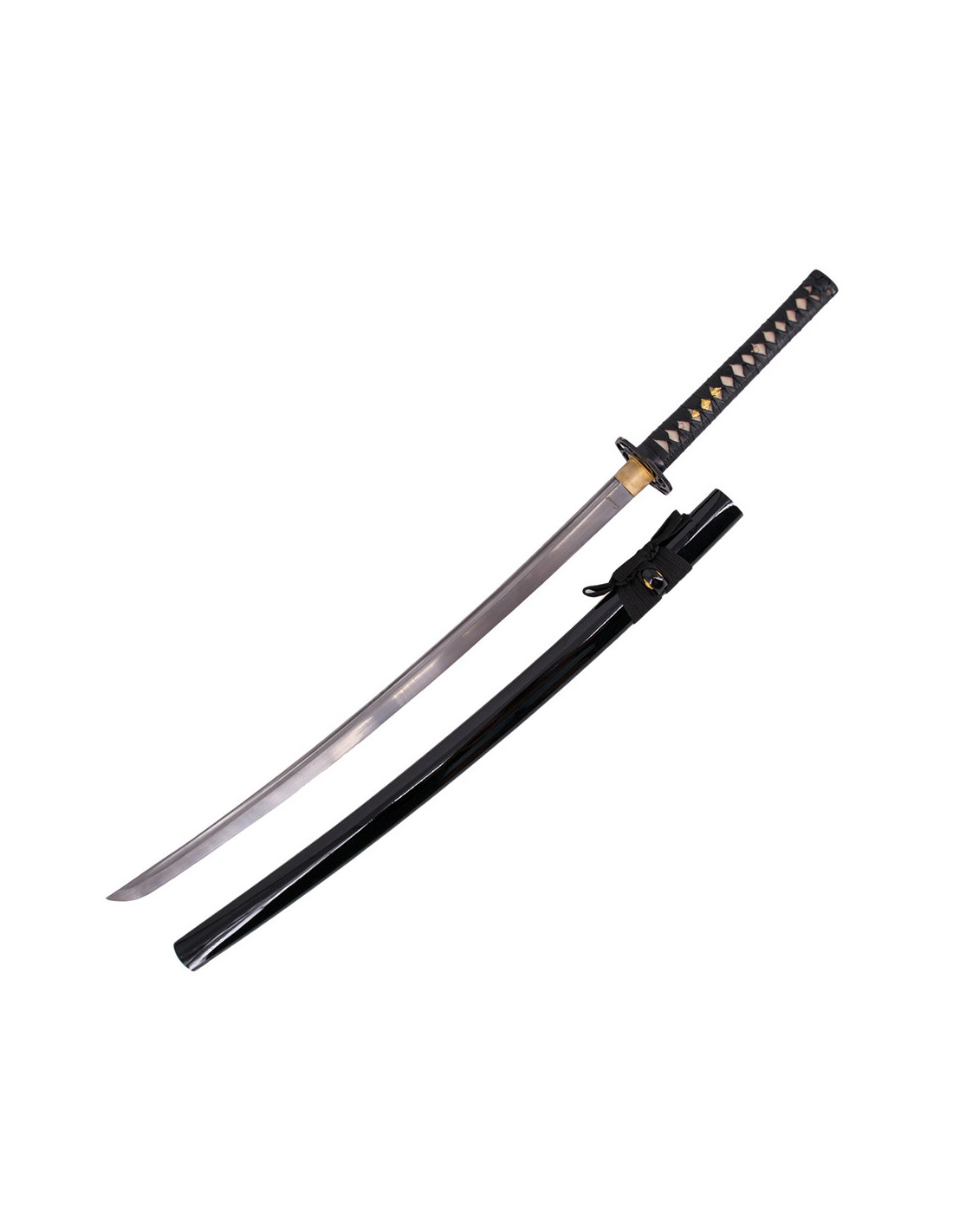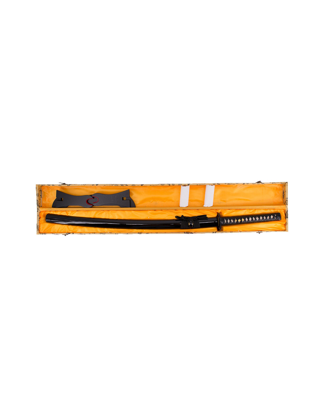 A katana inclui uma bainha envernizada em preto, que protege a lâmina e acrescenta um toque de elegância. O cabo encordado em preto garante uma pegada confortável e segura durante os movimentos. Além disso, incorpora um suporte e uma caixa de madeira forrada com tecido decorativo, tornando-se uma peça perfeita para exibir na sua coleção de armas orientais.