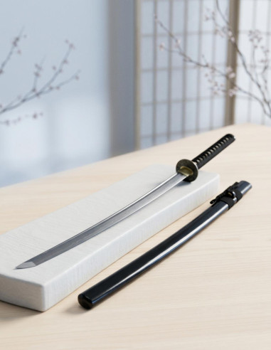 A bainha de madeira, pintada em preto brilhante, completa o design com acabamento sofisticado. Além disso, a katana vem com um saco de armazenamento de algodão e um kit de limpeza e manutenção em uma elegante caixa de madeira. O kit inclui óleo para proteger a lâmina, pano para aplicação, papel de arroz para manter a lâmina livre de sujeira, uchiko para tirar a poeira e um martelo para manipular os mekugis.