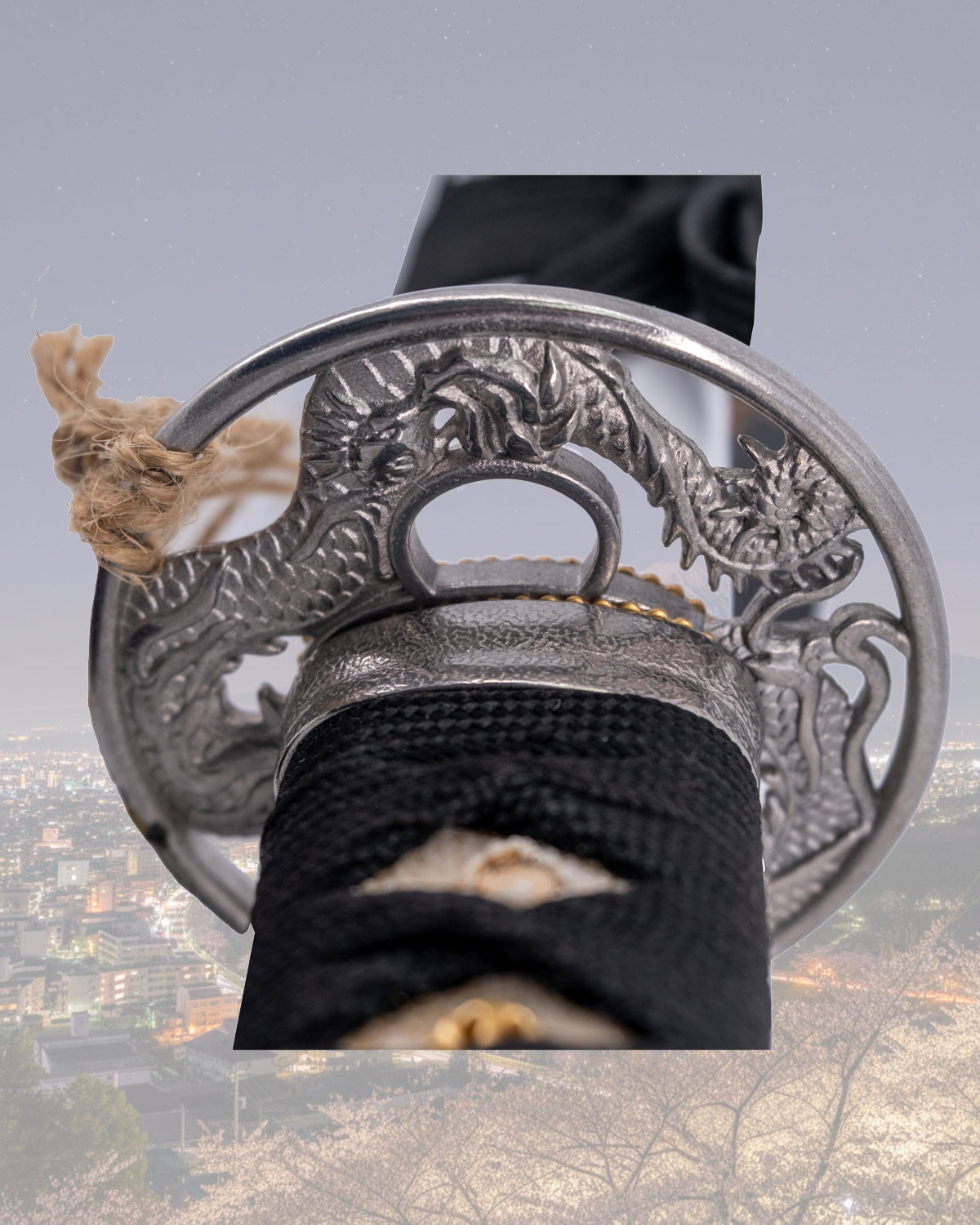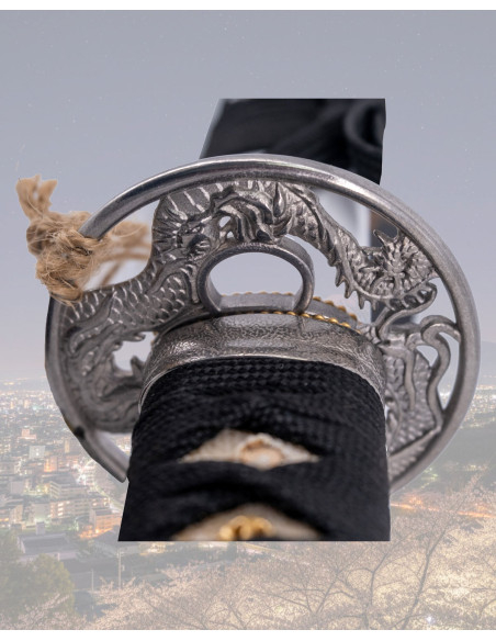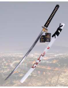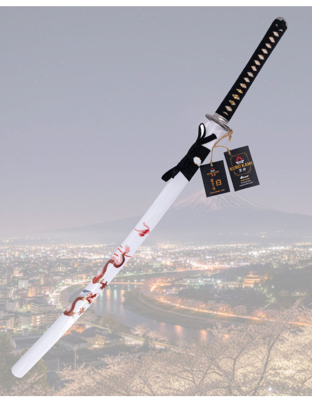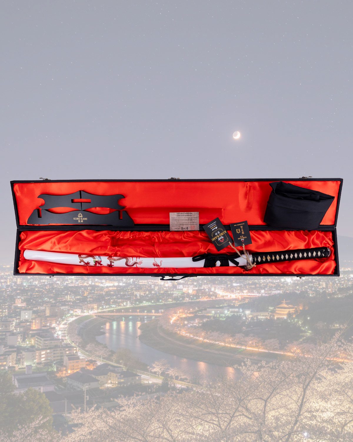 A bainha lacada em branco, decorada com um dragão em vermelho e dourado, transforma cada desembainhada em um gesto quase cerimonial, e o cordão preto na abertura acrescenta um detalhe funcional e estético. A tsuba circular e os acabamentos em aço inoxidável protegem e facilitam a manutenção, para que a peça se apresente impecável com o passar do tempo.