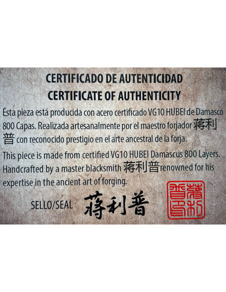 O hamon gravado que desenha o Monte Fuji no centro da lâmina não é apenas adorno, é uma assinatura que conecta a peça ao seu origem, enquanto o aço damasco forjado em múltiplas camadas oferece uma resistência que se aprecia na estabilidade do fio e na sensação firme ao empunhar a lâmina.