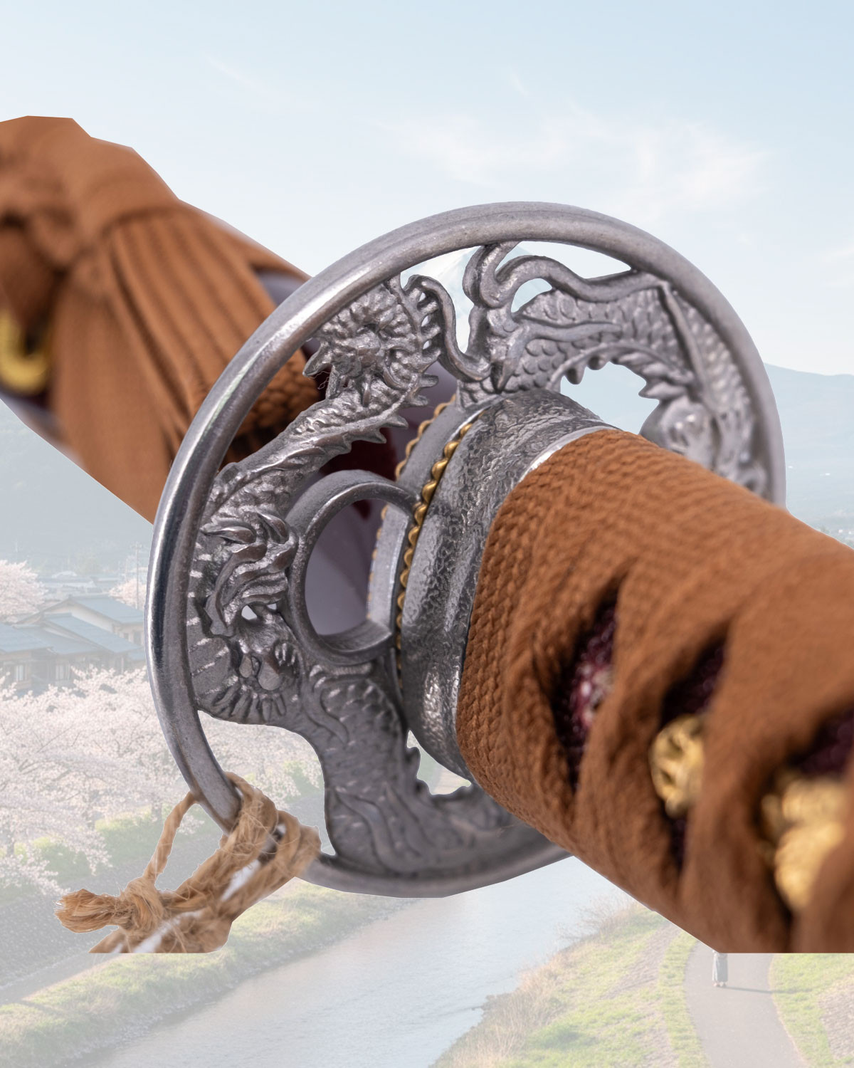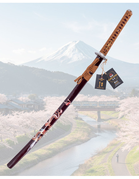 A saya laqueada em marrom escuro, adornada com dragões em tons dourados e vermelhos, protege a lâmina com dignidade e adiciona um impacto visual que se destaca em qualquer coleção ou exibição. Um cordão amarrado na parte superior finaliza o conjunto com caráter artesanal, perfeito para exibir junto ao suporte incluído.