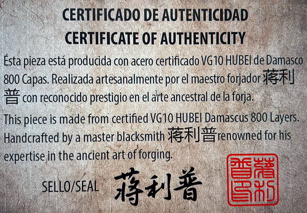 A tsuba e os remates metálicos em aço inoxidável aportam contraste e resistência, realçando o design sem tirar protagonismo à lâmina. Cada elemento é pensado para transmitir a história do ferreiro e o legado que o respalda, personificado na figura do Sr. Jiang Li Pu e sua dedicação ao ofício.