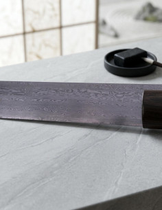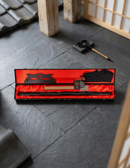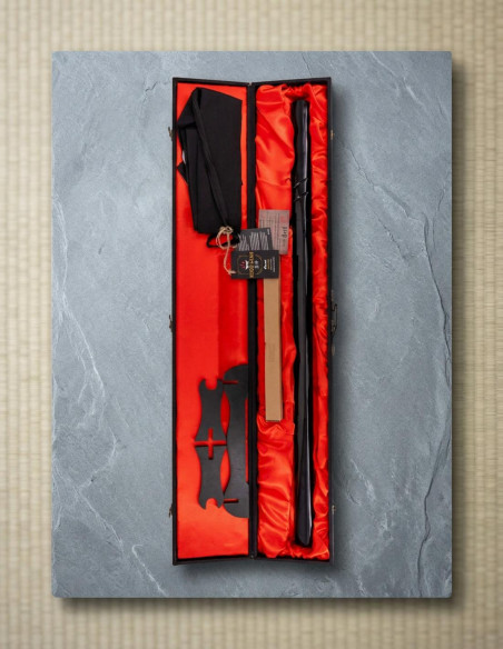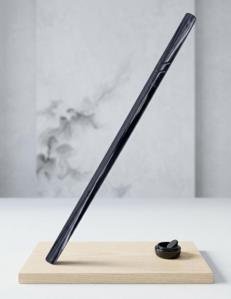 Sumi funciona como um canal, despindo o supérfluo para que sua essência brilhe autenticamente. A lâmina de 70,5 cm em aço de Damasco de 800 camadas reflete sua vontade de perfeição, enquanto a empunhadura torcida e laqueada permite uma aderência firme, facilitando movimentos precisos que deixam marcas do seu caráter. Com um peso que convida à fluidez em cada ação, esta katana não apenas responde à sua mão, mas também convida a uma conexão mais profunda com seu espírito. A estrutura em madeira laqueada preta combinada com seu suporte cria um conjunto que respira disciplina e estética sóbria, pronto para acompanhá-lo na busca pela sua melhor versão, em uma dança onde cada corte é um ato de equilíbrio e autoconhecimento.