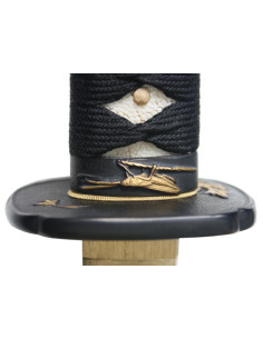 A alça é envolta em seda preta, forrada com triângulos de papel tradicionais (Hishigami) e pele de raio real. Dois mekugi cônicos (varas de bambu) conectam a espiga longa e o cabo da espada.