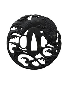 Mas isso não é tudo. Esta impressionante espada de samurai apresenta uma montagem em preto e branco, com pele de arraia preta no punho. Além disso, seu tsuba de ferro preto é lindamente projetado com koi detalhado, tornando-o ainda mais impressionante. Os acabamentos antigos das peças completam o aspecto estético desta magnífica katana.