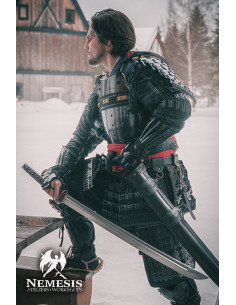 A empunhadura, adornada com detalhes decorativos em tons escuros e vermelhos, oferece uma pegada confortável e segura, permitindo que você desfrute de cada batalha sem preocupações. Além disso, seu design não é apenas visualmente impactante, mas também respeita a profunda tradição samurai, tornando-a um verdadeiro centro de atenção em qualquer evento de LARP.