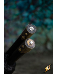 A ponta da lança é primorosamente adornada com runas incrustadas em acabamento dourado, dando-lhe uma aparência majestosa e mágica. Este detalhe não só o torna visualmente impressionante, mas também evoca a mística e o poder das lendas antigas. O bastão da lança, com acabamento em uma elegante cor preta meia-noite, apresenta uma textura que lembra os veios da madeira, acentuando sua aparência mística e autêntica.