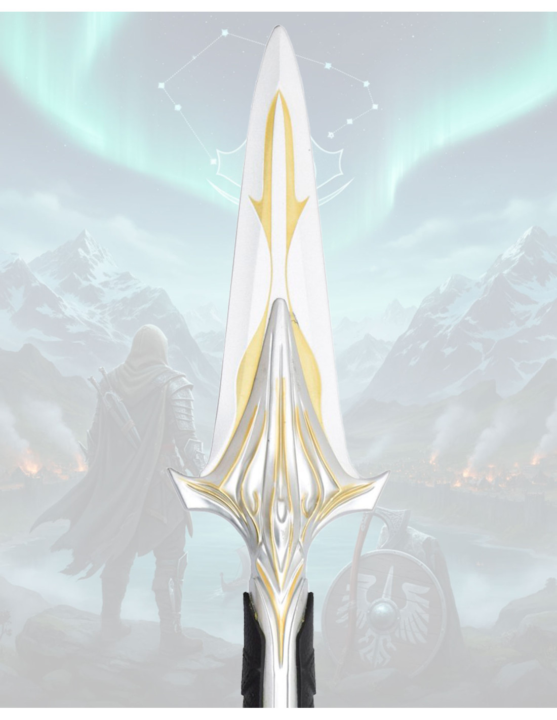A lâmina de aço apresenta uma silhueta ampla e pontiaguda, realçada por linhas ornamentais em tons dourados, que transmitem um acabamento de alta presença e resistência visual, ideal para exibir com orgulho. A combinação de metal e plástico na empunhadura oferece um equilíbrio entre robustez e manuseio confortável ao colocá-la, enquanto os relevos e adornos dourados adicionam um toque de sofisticação que eleva qualquer ambiente.
