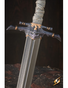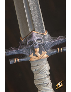 O protetor de mão cor de aço é decorado com o rosto de um esqueleto, enquanto o cabo é moldado e pintado para parecer envolto em pele esfolada de covardes. Um botão de anel pontiagudo acentua a natureza cruel deste design. Esta espada grita o mal!