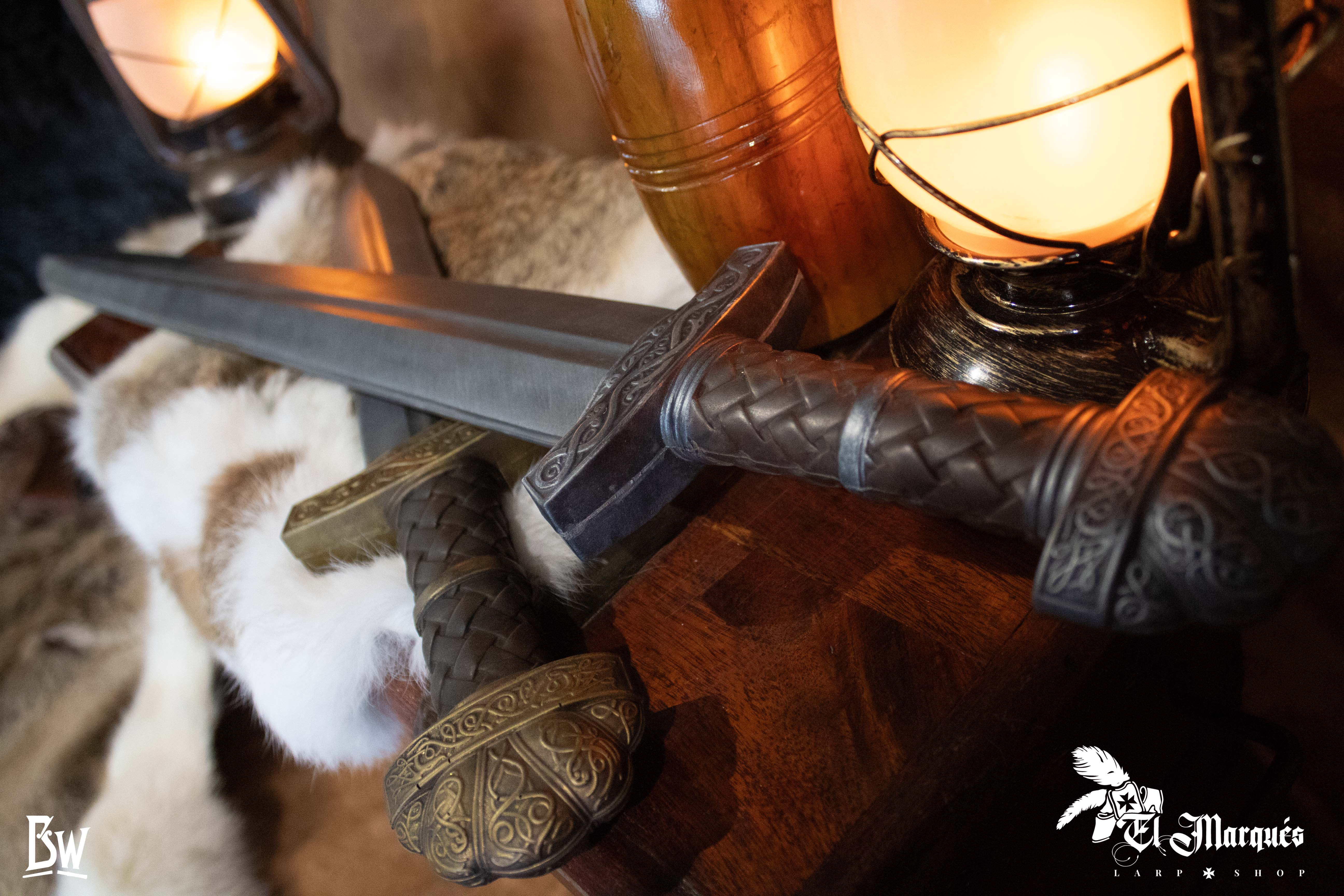 A guarda, com design inspirado em motivos vikings, oferece proteção e reforça a estética guerreira. Cada elemento foi cuidadosamente elaborado, desde o comprimento da lâmina até a harmonia entre função e aparência. Além disso, sua ambientação visual inclui detalhes como peles e lanternas antigas, ressaltando a atmosfera legendária que envolve este produto.