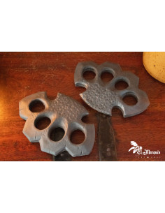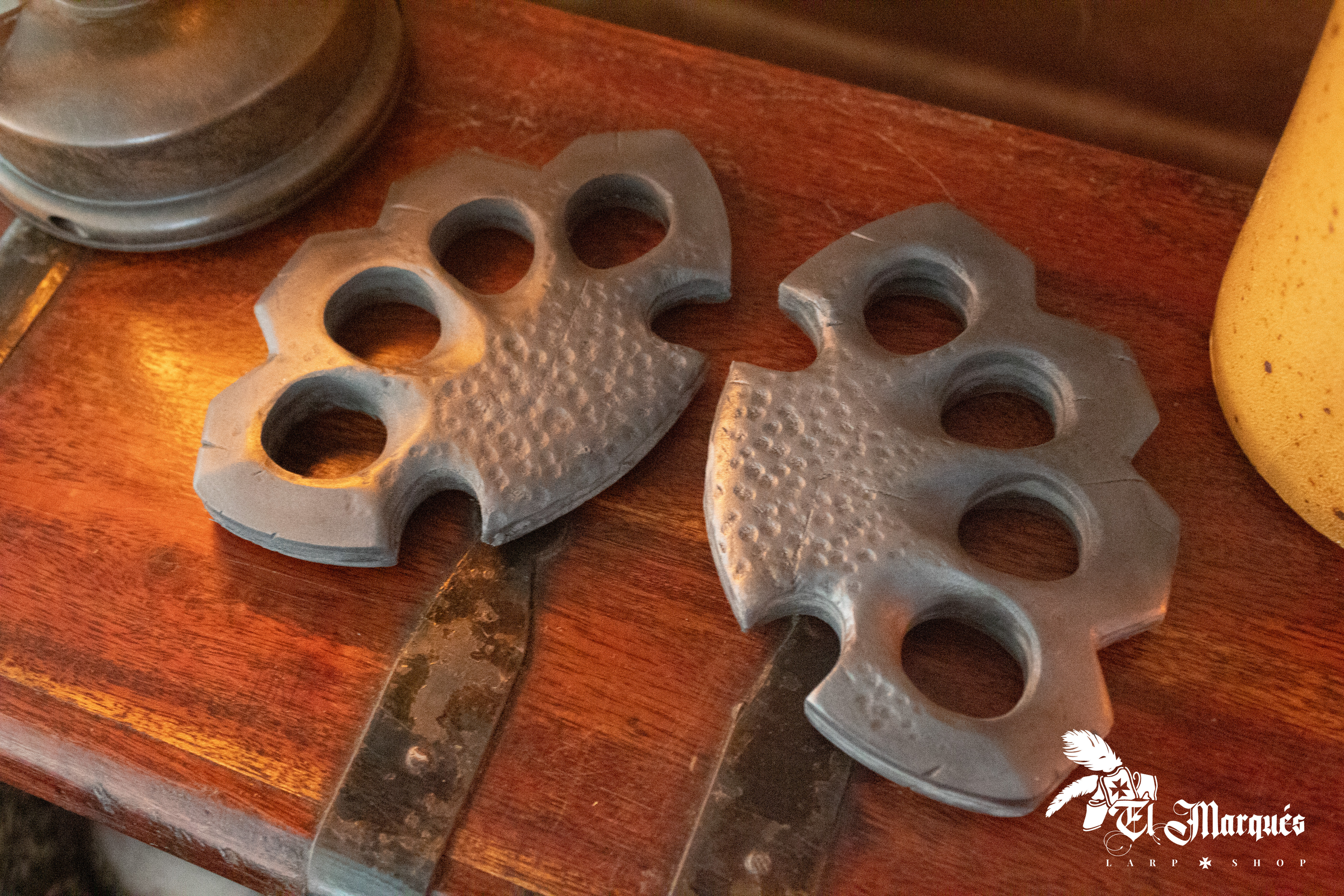Fabricado em espuma de alta densidade sem núcleo, esta peça é totalmente inofensiva e foi feita para atender aos padrões de segurança em eventos de LARP. Seu design inclui três buracos amplos e um quarto com uma forma diferente que adiciona um toque visual único, além de garantir uma pegada confortável. As bordas são suaves para evitar qualquer perigo e permitem uma integração perfeita em combates recreativos.