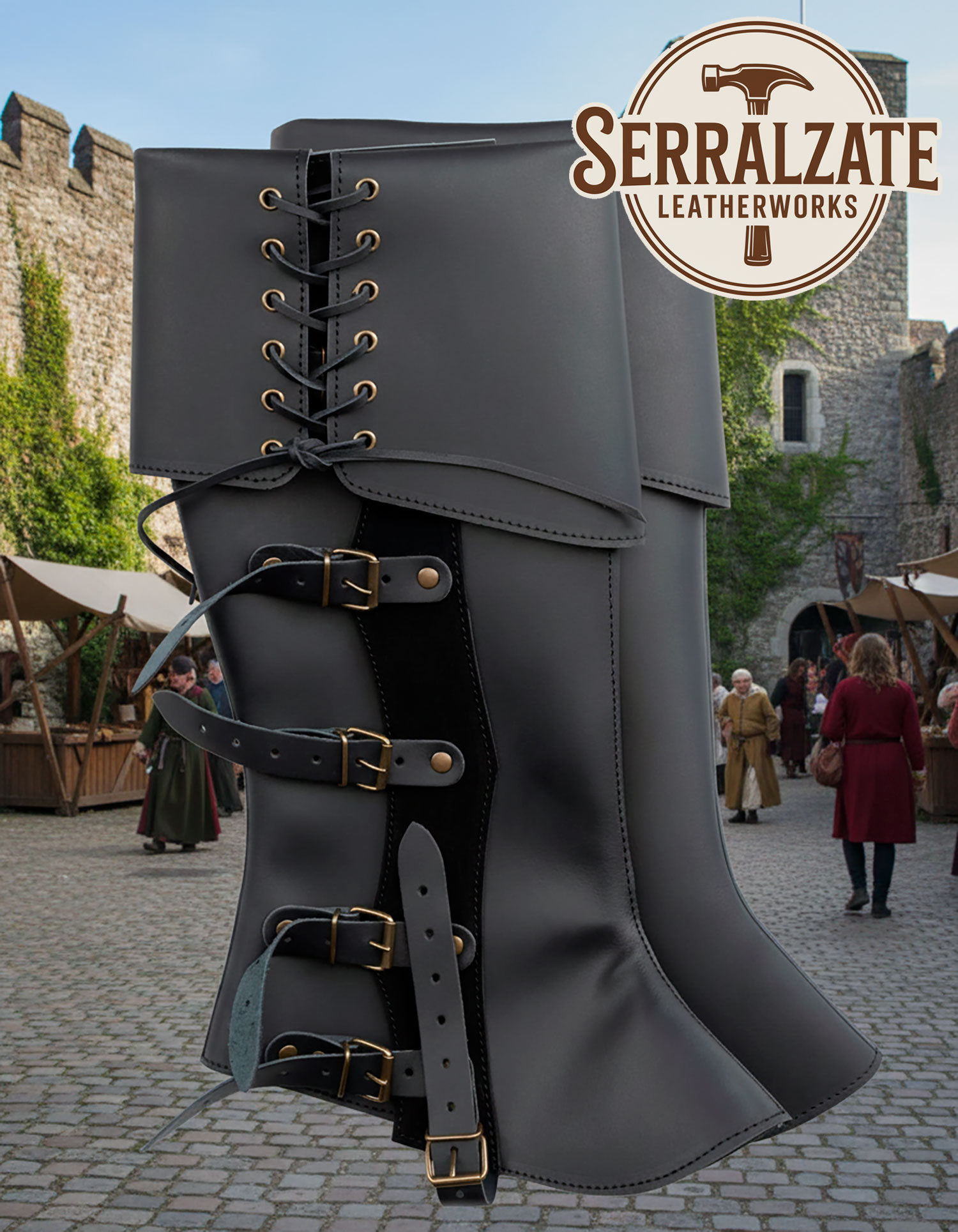 Descubra as Polainas Medievais Valerio ajustáveis, uma obra-prima da Serralzate LeatherWorks que o aproximará do encanto da época medieval. Cada par de polainas é cuidadosamente feito em couro, refletindo a qualidade excepcional e o design único desta marca espanhola.