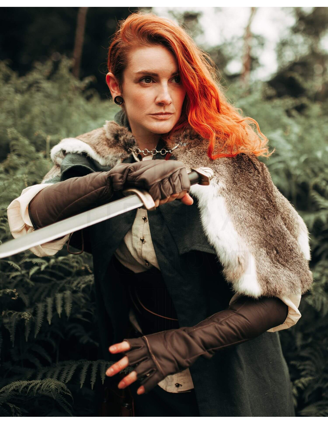 Procurando luvas que combinem estilo e funcionalidade, perfeitas para completar seu visual de aventureiro ou guerreiro? Essas luvas medievais sem dedos em couro modelo Gillian são a escolha ideal para dar um toque autêntico aos seus jogos de interpretação ao vivo, cosplay ou temática steampunk.