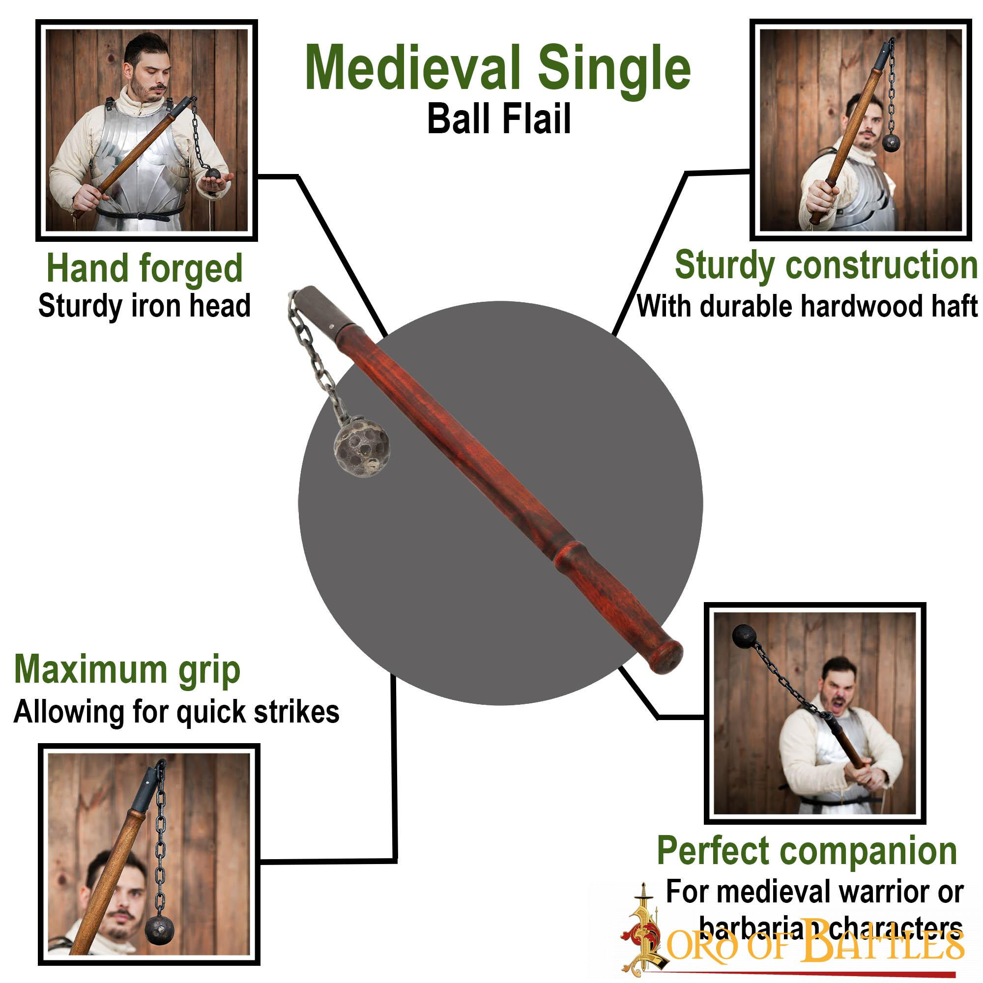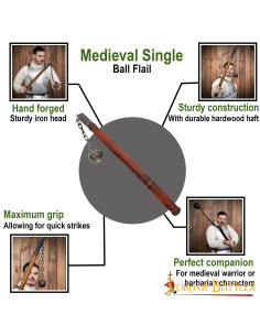 - Materiais de alta qualidade: Feito de ferro forjado à mão resistente e um cabo de madeira de alta qualidade, esta maça é construída para durar ao longo dos anos. Não é apenas um item de colecionador, mas uma verdadeira arma de combate.