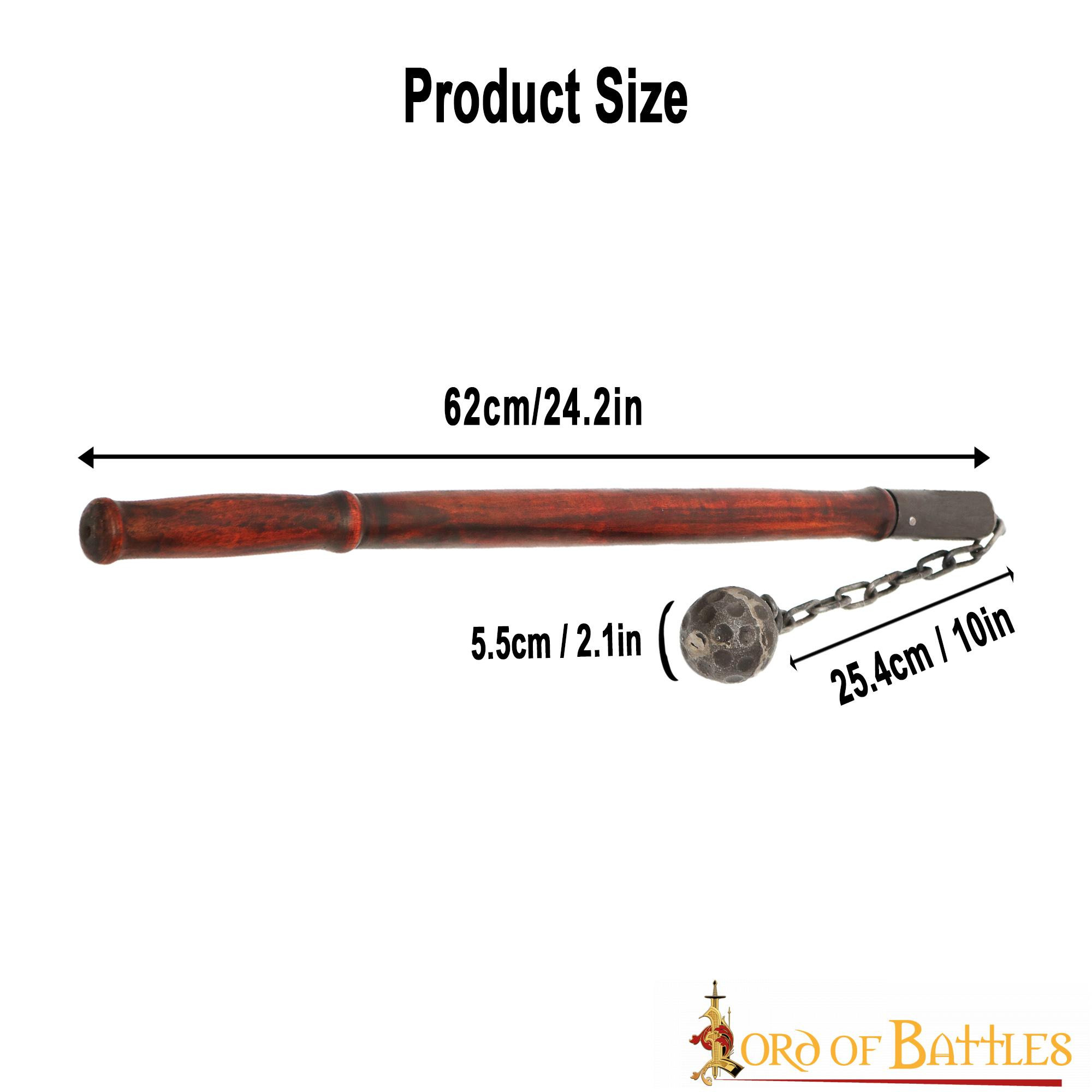 Prepare-se para causar medo nos corações de seus inimigos com nossa Maça Medieval com Bola e Corrente Sem Espinhos! Esta poderosa arma medieval apresenta uma bola de ferro forjado de aproximadamente 5 centímetros de diâmetro conectada a uma robusta corrente de ferro de aproximadamente 25 centímetros de comprimento (feita de ferro de 5 mm de espessura, com alças de aproximadamente 2,5 cm de largura). A haste de madeira com aproximadamente 61 centímetros de comprimento foi projetada para oferecer ótima aderência e controle. Possui acabamento natural tradicional e é ideal para um personagem soldado ou mercenário.