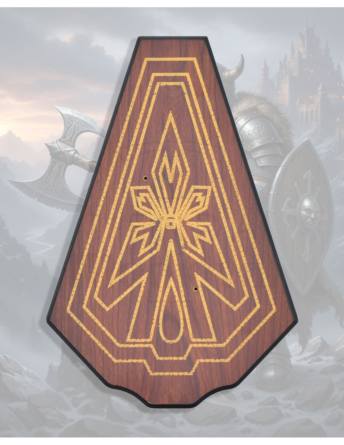 Esta peça homenageia o herói anão, oferecendo uma réplica ornamental que se destaca por sua presença e seu acabamento projetado para exibição. O design de lâmina dupla e o acabamento fosco na cabeça conferem um aspecto feroz e realista, enquanto as decorações geométricas douradas acrescentam um ar cerimonial, perfeito para quem busca uma peça com história visual.
