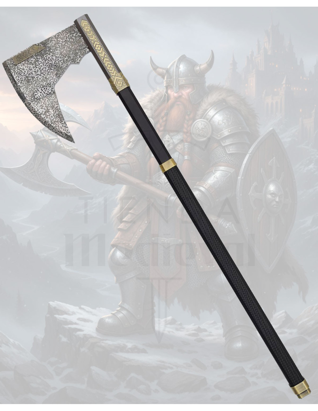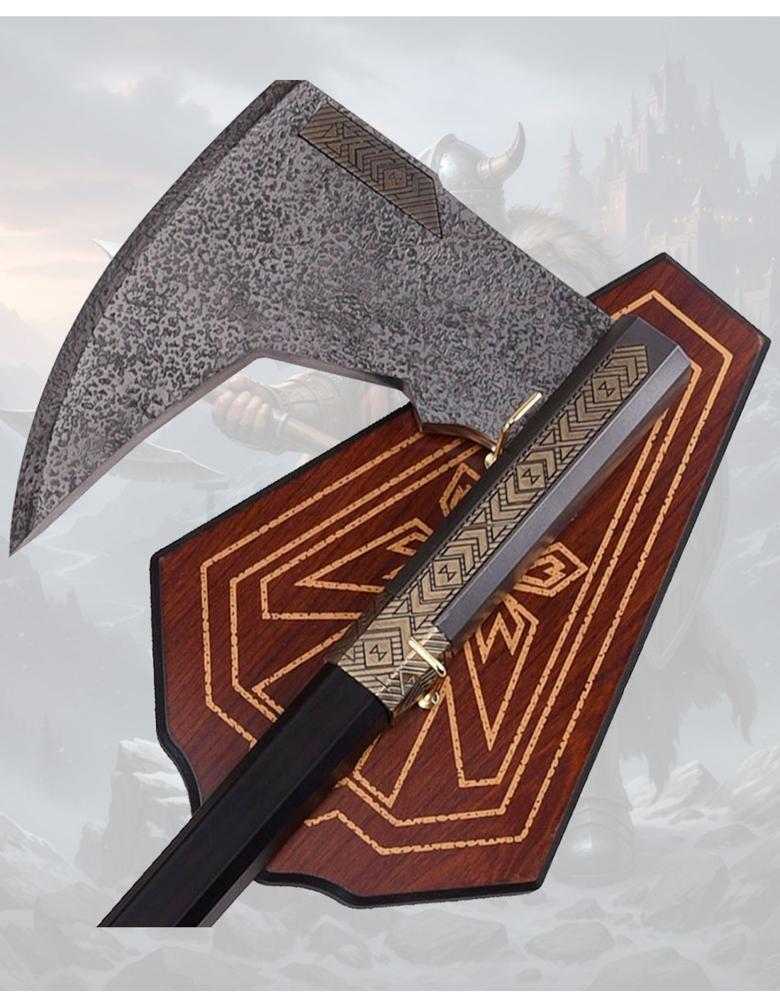 Este machado combina aparência rústica com detalhes cuidados, por isso não só chama a atenção, mas facilita uma exibição sofisticada. A lâmina com acabamento manchado transmite autenticidade artesanal, proporcionando uma sensação robusta que valoriza espaços temáticos ou salões com caráter. A borda curva adiciona dinamismo visual, fazendo com que a peça pareça pronta para ação, mas pensada para brilhar, não para atrapalhar.