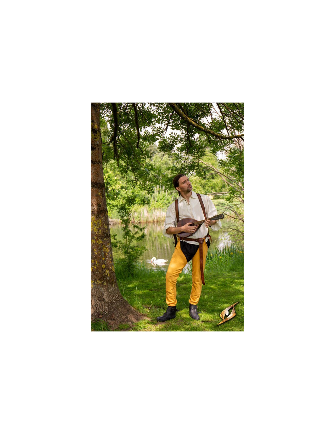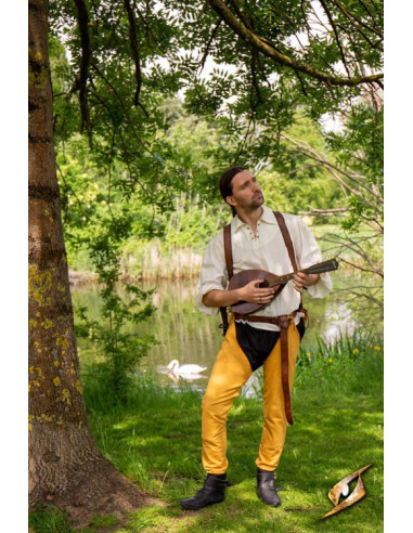 Descubra a Calça de época em algodão na cor Amarelo Grifo, um exemplo típico da moda medieval usada durante a Idade Média e o Renascimento. Esta meia de algodão áspero é ideal para personalizar o visual do seu personagem Larp, pois é vendida por unidade e você pode misturar cores do seu gosto.