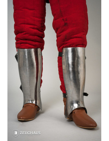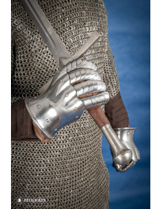 Enfrente a batalha com as manoplas de aço polido do século XIV! Inspiradas em designs do período entre 1350 e 1415, estas manoplas representam a excelência na proteção das mãos dos guerreiros medievais. Projetado para oferecer a máxima flexibilidade, seu formato de ampulheta permite a livre movimentação do pulso, garantindo um manuseio ágil e preciso da sua arma.