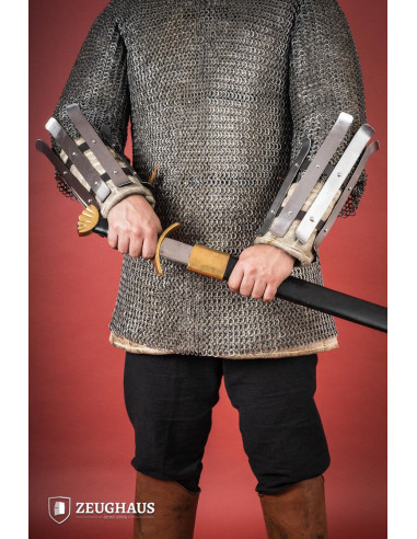 Feitas de aço com 1,6 mm de espessura, essas manoplas testemunham a engenhosidade e o artesanato dos tempos medievais. A sua espessura pode variar ligeiramente devido aos métodos artesanais utilizados no seu fabrico, tornando-as peças únicas e autênticas.