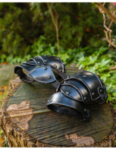 O acabamento escurecido brilhante não apenas proporciona uma aparência robusta e uniforme, mas também protege a superfície contra abrasões visíveis, mantendo a estética escura que se encaixa em recriações, eventos ou trabalho cênico. Nas imagens, pode-se ver as proteções para os cotovelos em acabamento preto com rebites visíveis, que ilustram o efeito do escurecido e da articulação metálica, proporcionando coerência visual se você completar seu equipamento.