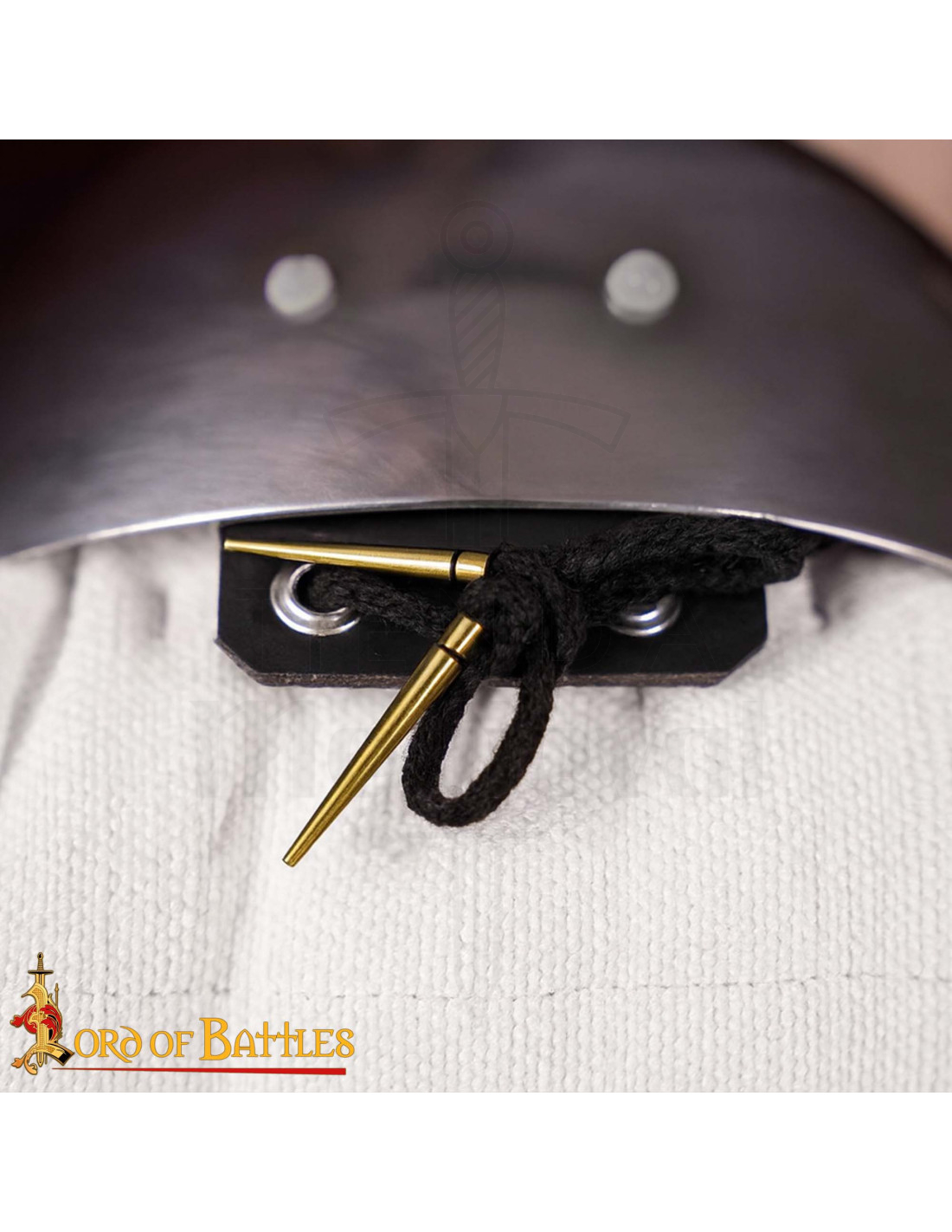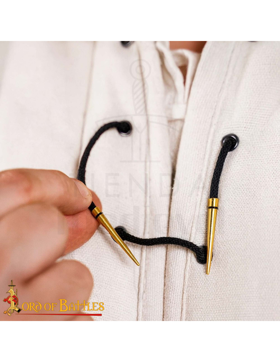 Na imagem, são visíveis cordéis pretos com pontas metálicas douradas alongadas e levemente estreitas antes de sua finalização, uma forma que garante a fixação ao tecido e facilita a passagem por ilhós e passadores. Embora o conjunto inclua cinco unidades, a aparência visual lembra as séries usadas em recriações, pois o latão polido traz aquele toque de autenticidade que se destaca em contextos LARP e de recriação histórica.