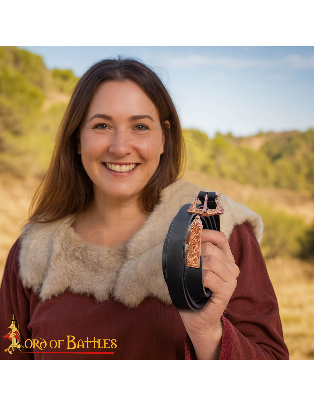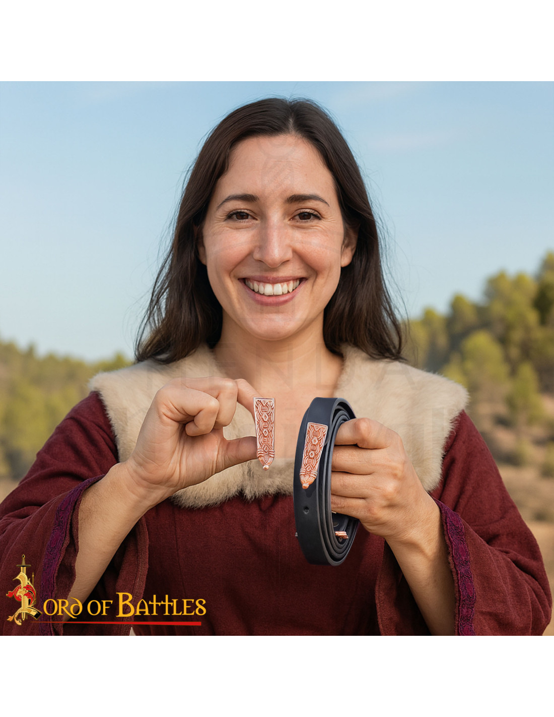 Seu formato retangular alongado, com uma extremidade ligeiramente arredondada e a outra em ângulo reto, facilita um encaixe harmonioso com correias finas, mantendo a peça fixa e elegante sem adicionar volume desnecessário. Perfeita para projetos de couro reduzido e para complementar trajes de guerreiro, comerciante ou nobre recriados com critério museográfico.