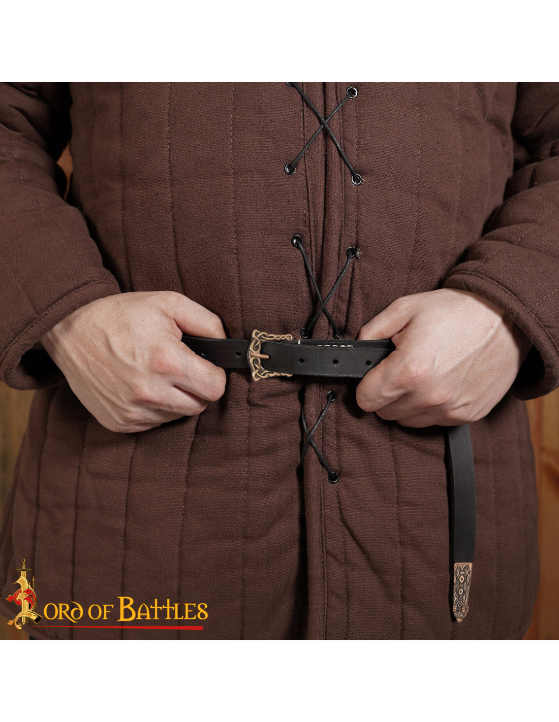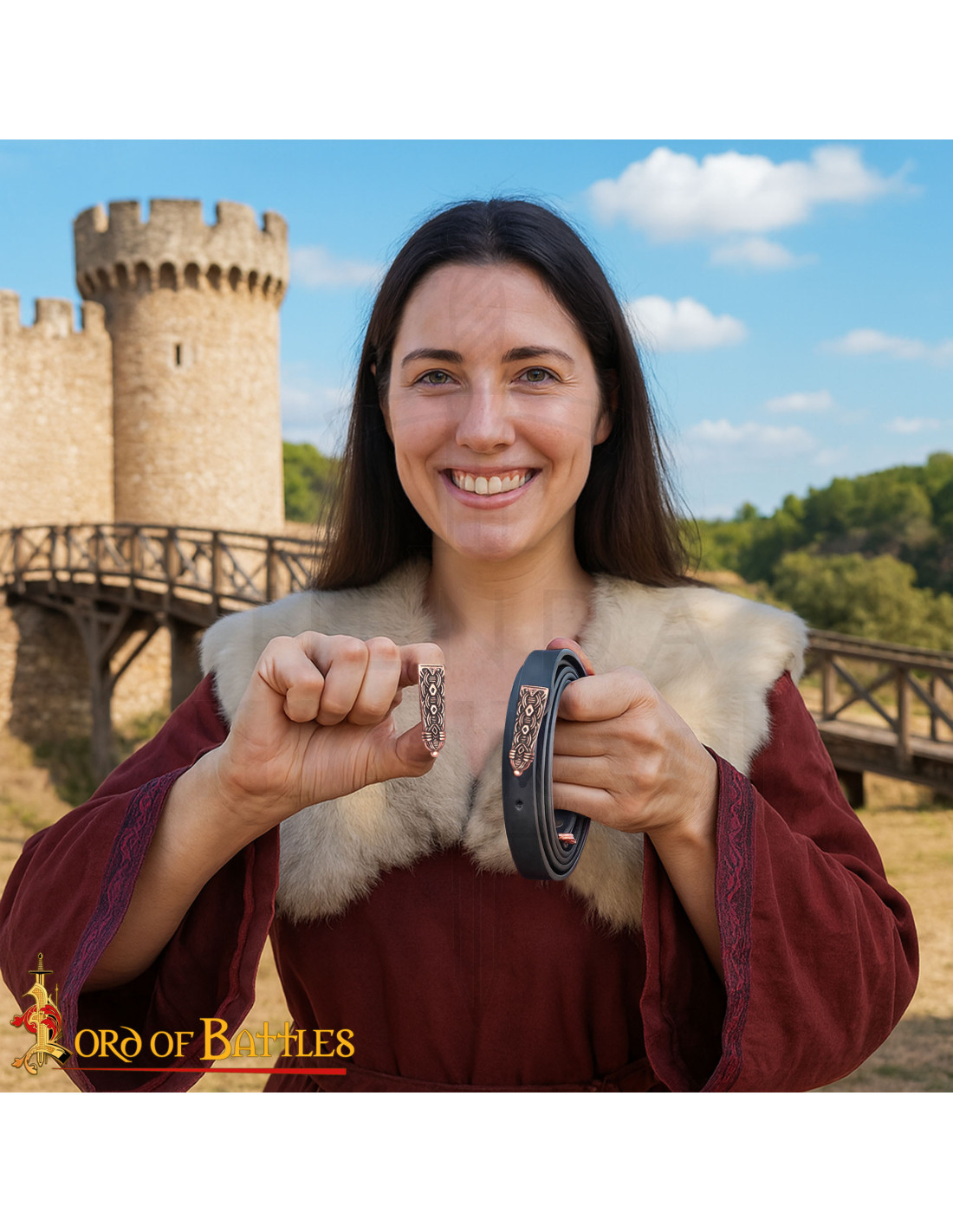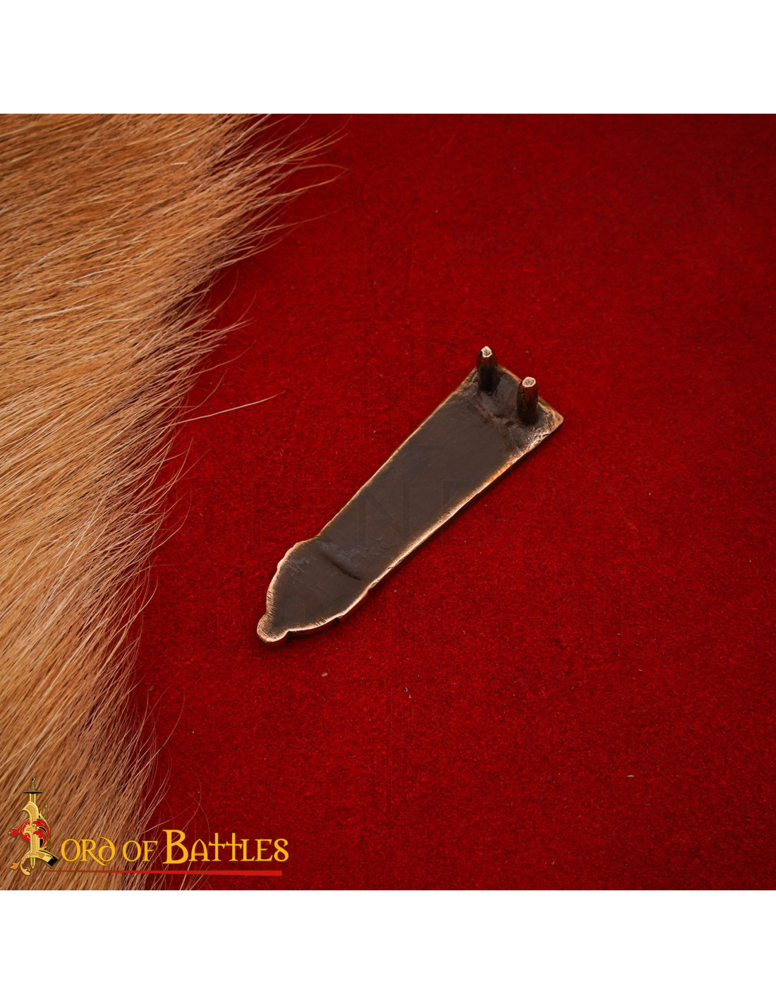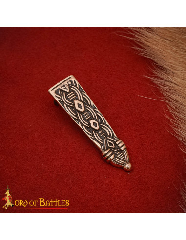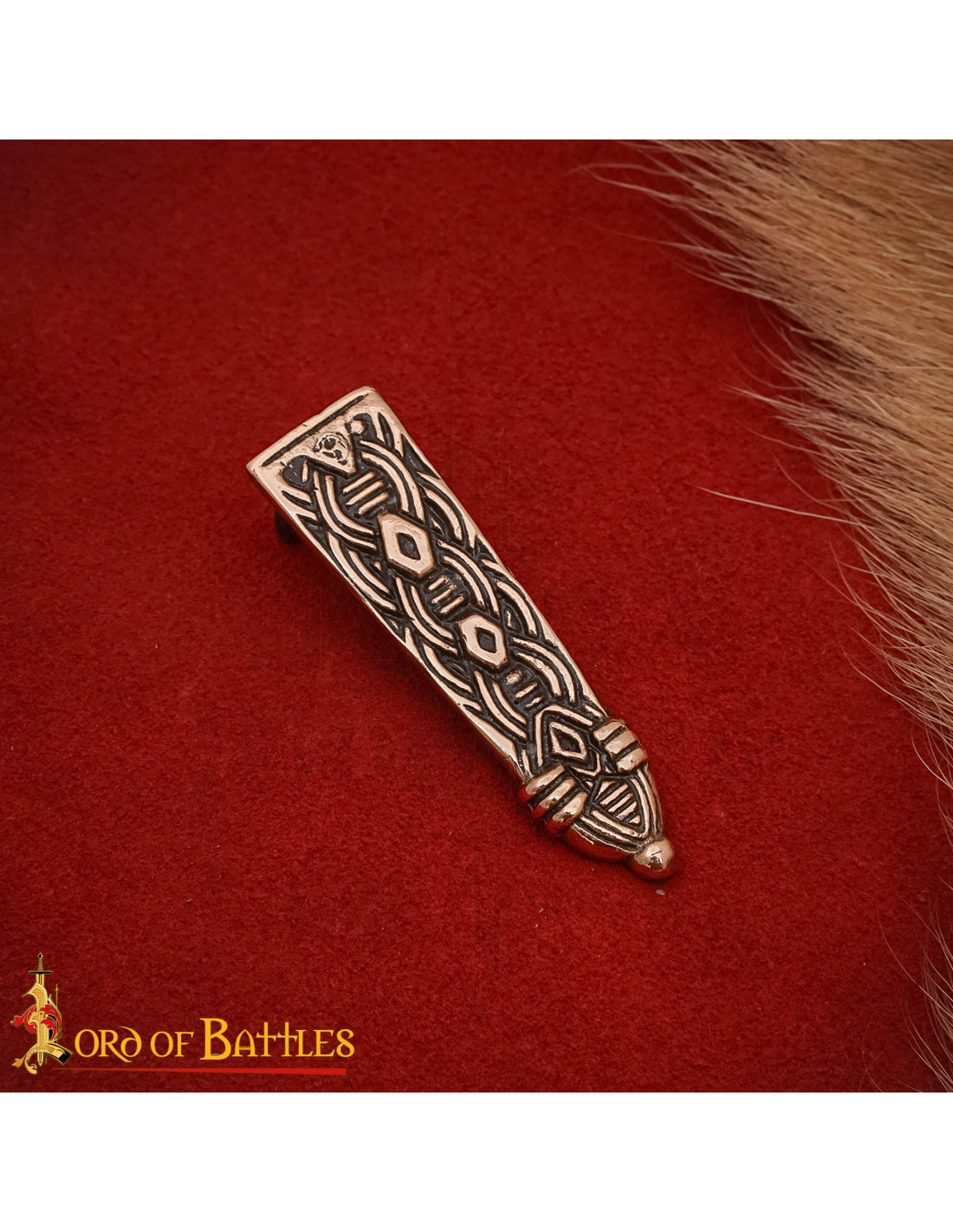 Inspirada em achados nórdicos da Era Viking, esta ponta traz um ar de autenticidade que distingue um traje recriado de uma simples imitação. O acabamento em bronze envelhecido e os toques em preto realçam o relevo, dando profundidade ao entrelaçado de nós e aos losangos geométricos, de modo que o motivo é percebido com clareza de qualquer ângulo.