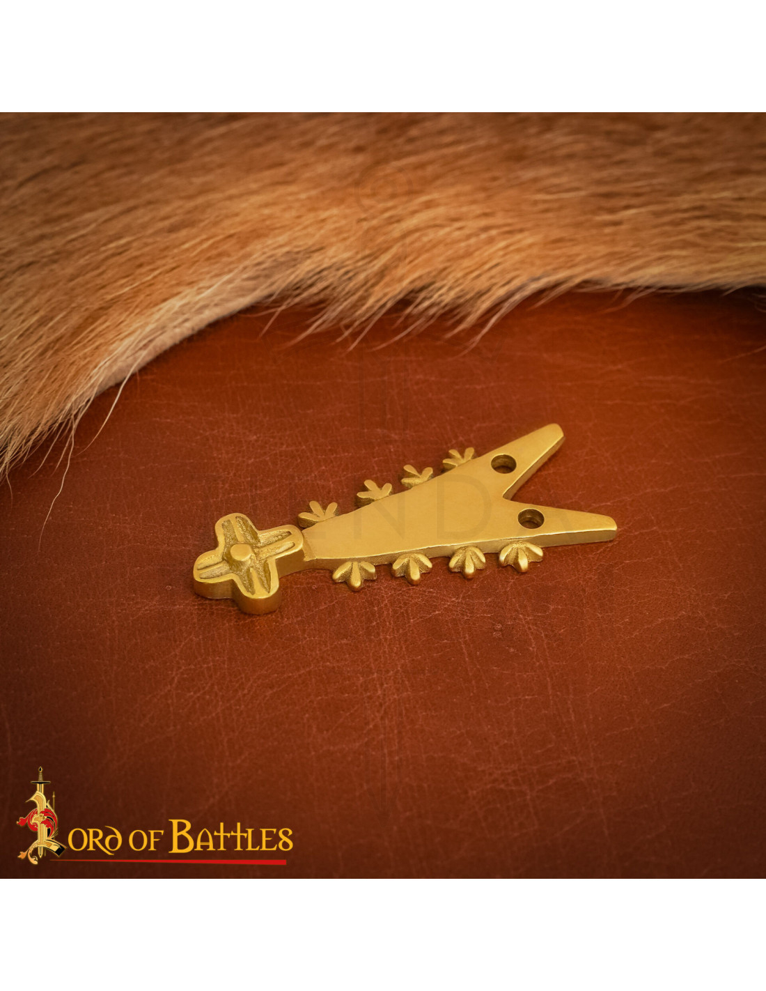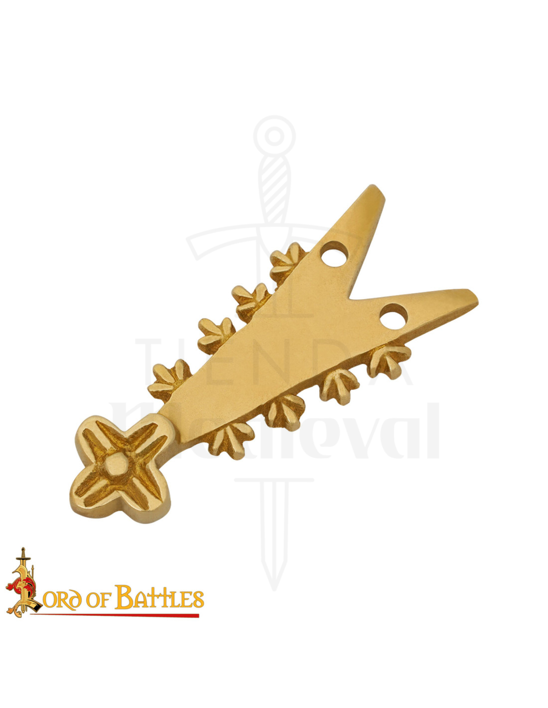 Esta peça evoca a sofisticação das oficinas do Renascimento, com um brilho uniforme que se destaca sobre couro escuro ou tons terrosos. Sua extremidade pontiaguda se bifurca em duas pontas com pequenos orifícios, pensados para uma fixação limpa e discreta, enquanto as bordas decoradas com motivos que parecem folhas ou dentes trazem textura e elegância. Do lado oposto, uma cruz com um motivo geométrico em relevo acrescenta caráter e coerência ao conjunto.