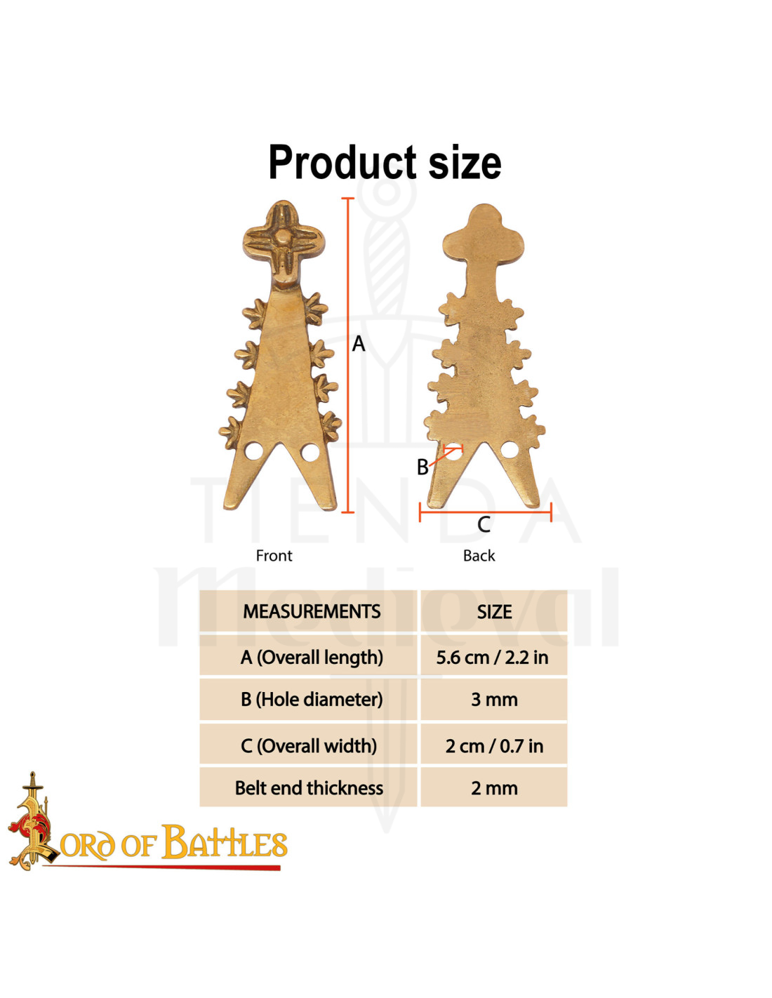 A escolha do latão sólido se traduz em uma sensação de solidez e longevidade, o que significa que você não terá que se preocupar com peças frágeis durante jornadas de feira, jornadas de LARP ou representações prolongadas. Seu acabamento liso e brilhante facilita a combinação com diferentes trajes, sem perder conforto nem funcionalidade: mantém a extremidade do cinto fixa, evita desfiados e oferece um acabamento profissional que realça qualquer vestimenta histórica ou inspirada em épocas passadas.