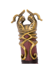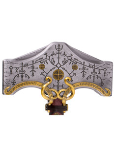 Este impressionante modelo do Martelo de Thor mede 32,0 cm de largura e 50,0 cm de altura e é feito de aço, proporcionando durabilidade e solidez que impressionarão qualquer entusiasta de réplicas. A cabeça do martelo cor de níquel é adornada com detalhes dourados e runas luminescentes que evocam a magia e a sabedoria antiga da mitologia nórdica, conforme retratada em ‘God of War’.