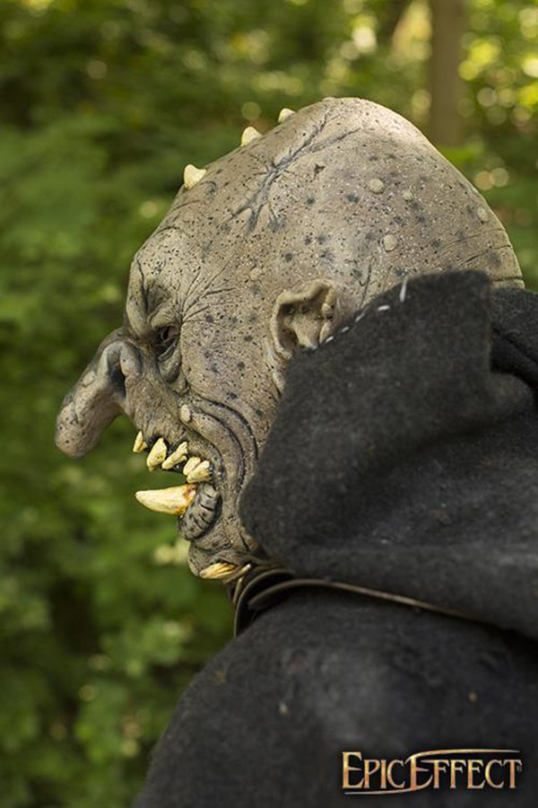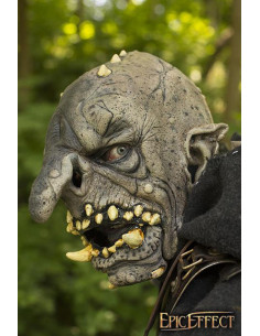 Esta máscara tem características clássicas de troll: nariz bulboso, orelhas pontudas e fileiras de dentes irregulares. Assim como os buracos escuros que os trolls habitam, criamos uma pele altamente texturizada que se parece com pedra. Com várias cicatrizes, sulcos rígidos e estrias, esta máscara mantém uma sensação ameaçadora enquanto parece realista.