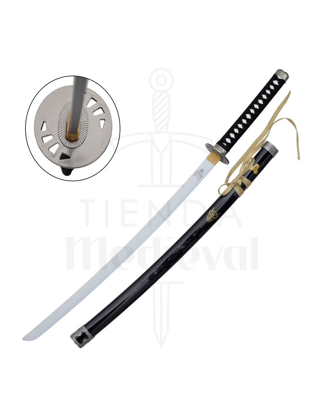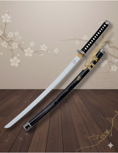 Sua bainha preta brilhante, complementada com um laço decorativo claro, facilita a exibição na sua coleção ou o uso como peça temática para eventos ou cosplay. A lâmina de 680mm, acompanhada de um peso leve e equilibrado, permite uma aparência realista sem se preocupar com a manobrabilidade. Além disso, seu comprimento total de 990mm e o escudamento em bambu proporcionam um aspecto autêntico e elegante.
