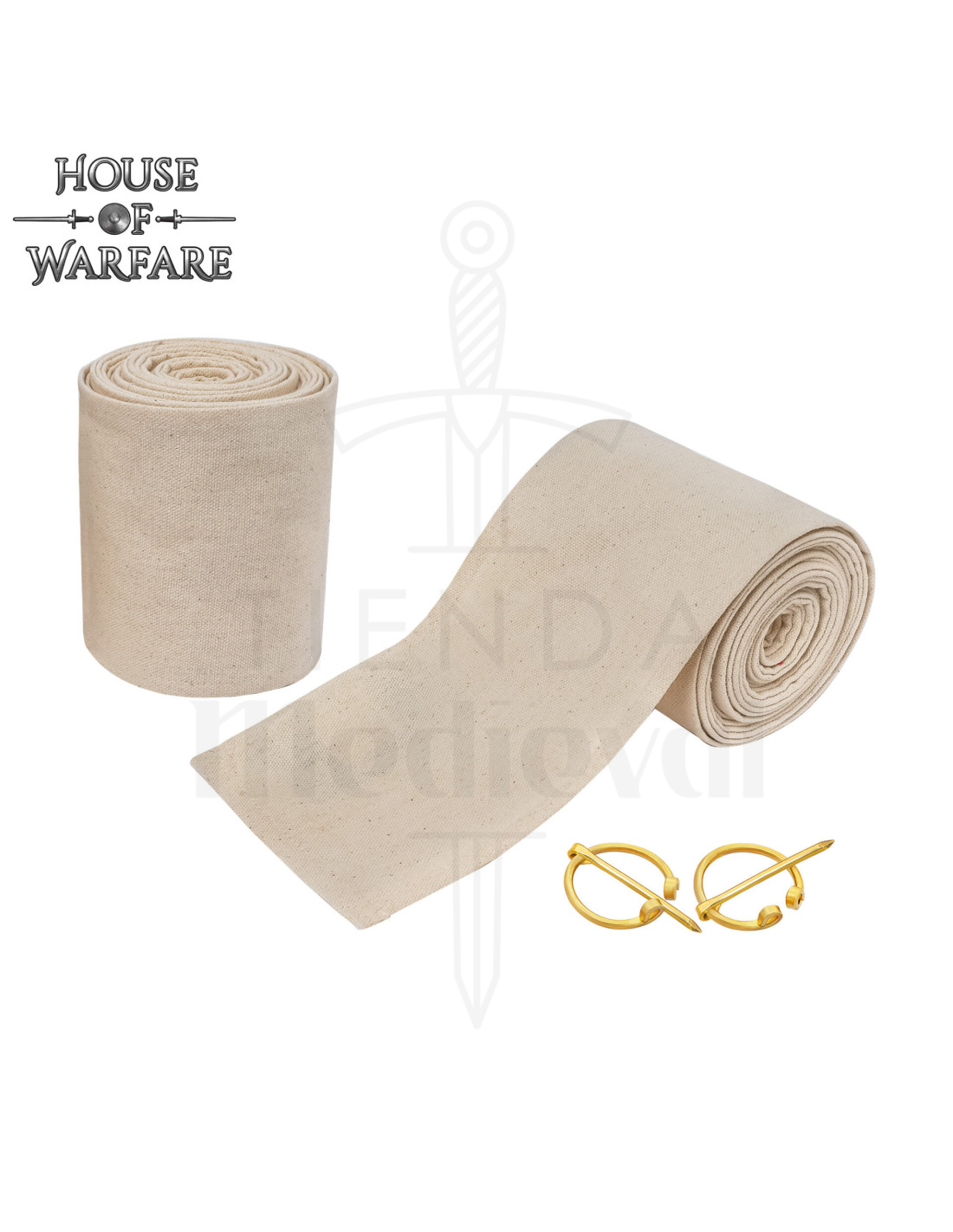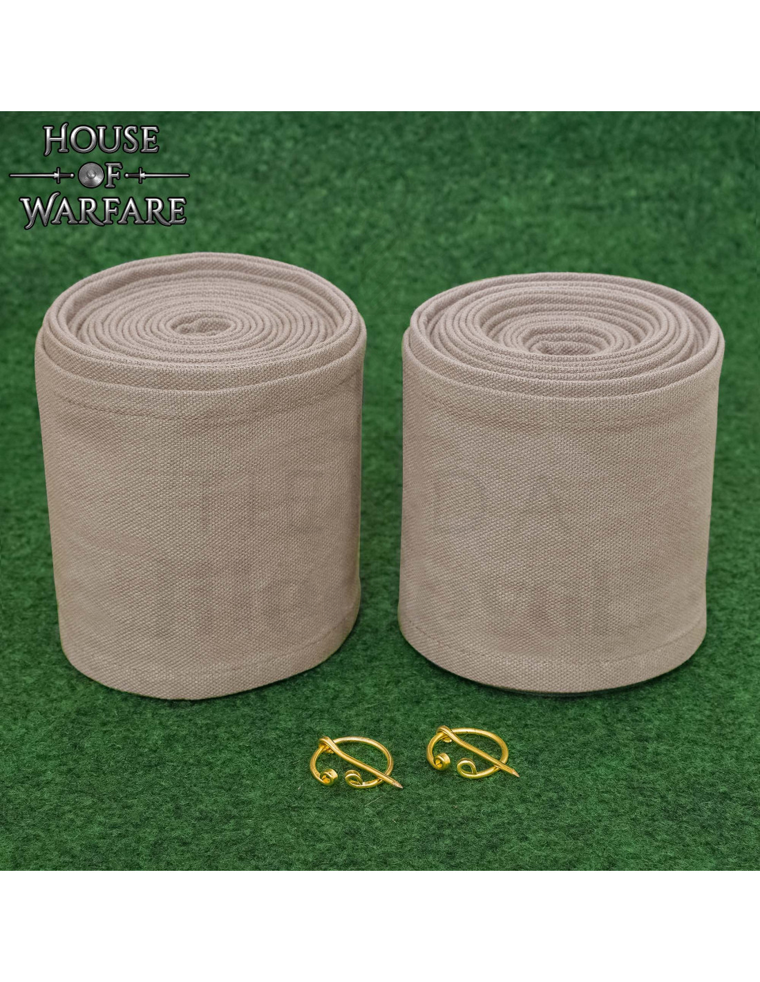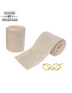 O conjunto inclui duas peças para ambas as pernas e fechos metálicos de latão que facilitam o ajuste, garantindo que as tiras permaneçam firmes durante a atividade. Visualmente, as peças aparecem enroladas em tom bege natural com uma textura grossa e resistente que transmite robustez e autenticidade, enquanto os fechos dourados, com uma barra central que se encaixa no círculo, acrescentam o acabamento histórico que realça qualquer vestuário.