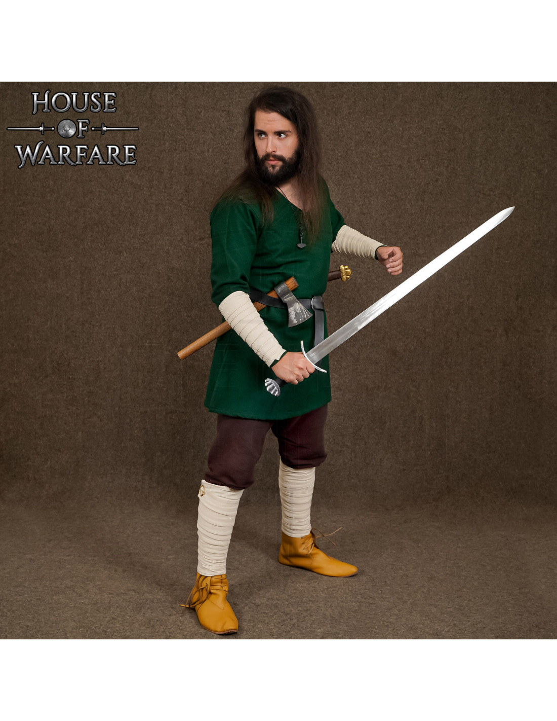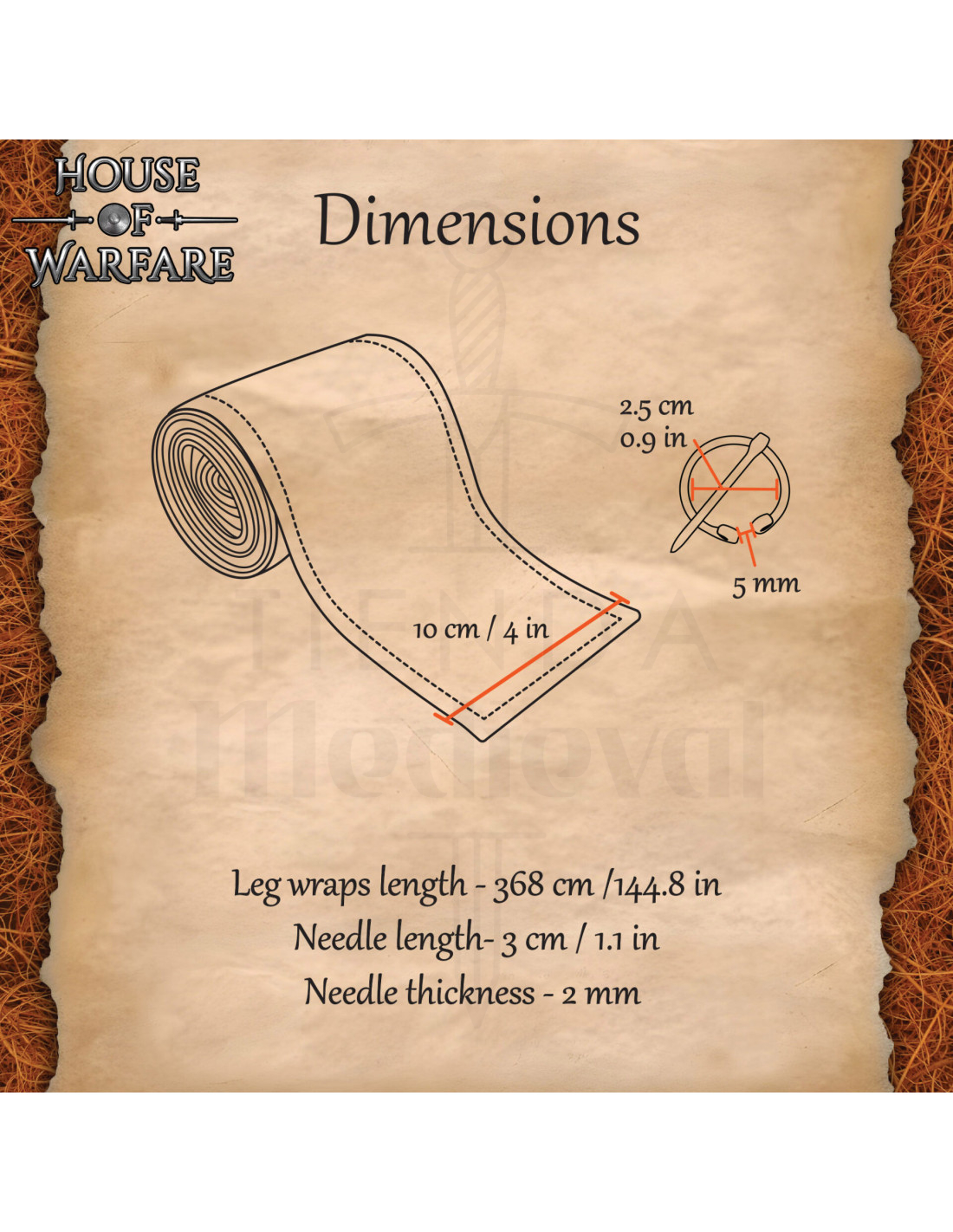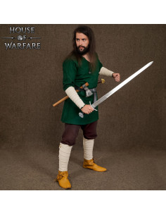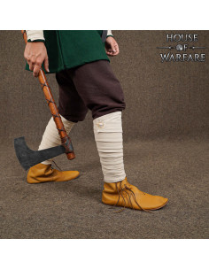 Seu comprimento generoso permite envolver completamente a panturrilha, criando proteção contra o terreno áspero e evitando o contato direto com elementos do equipamento, sem abrir mão da elegância rústica de uma estética viking e medieval fiel à época. O design pensado para uso prolongado garante conforto, fixação e uma presença visual que completa o personagem.