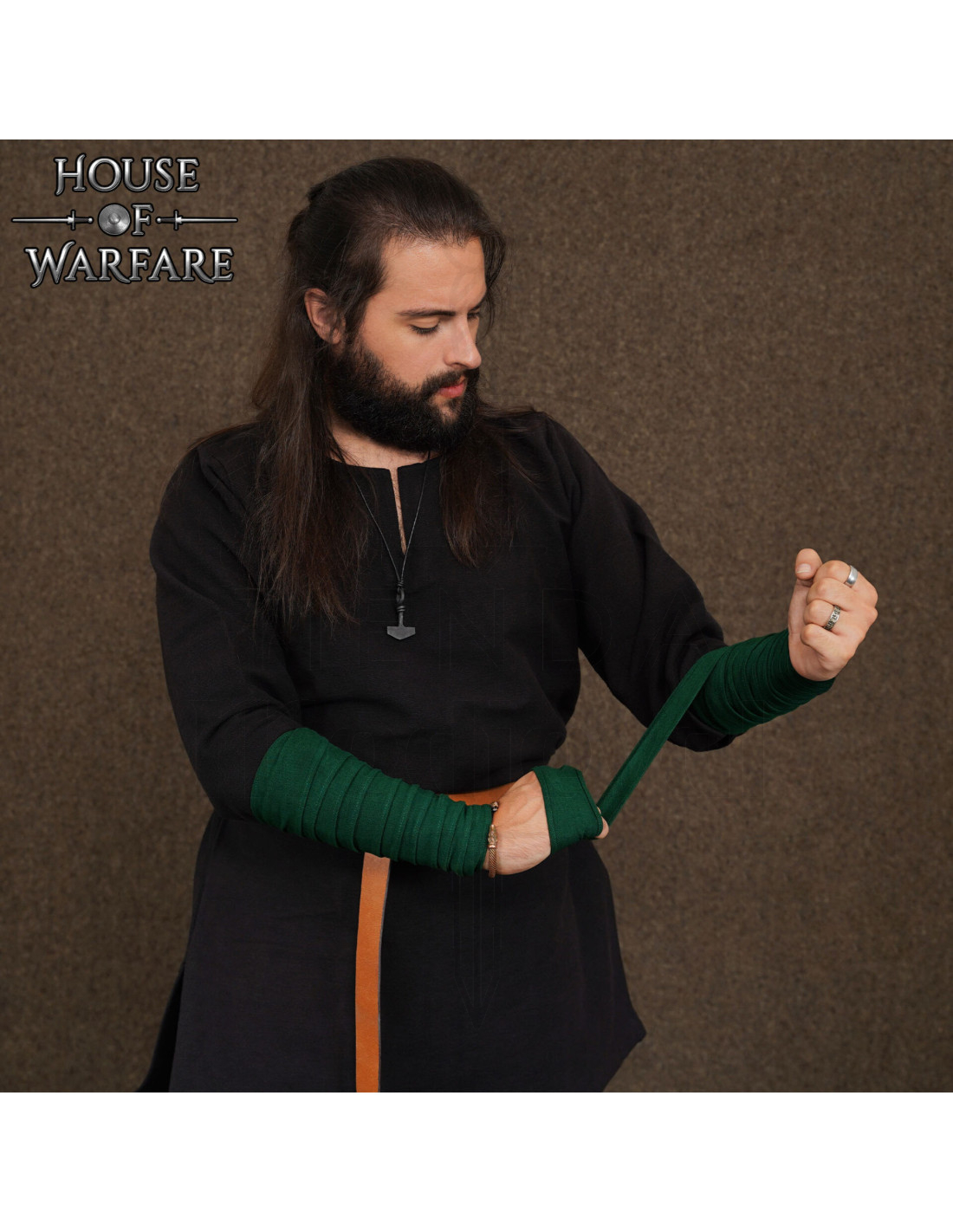 Essas tiras em verde garrafa envolvem seu antebraço com uma sensação firme, mas flexível, graças a uma lona de algodão tecida que respira e acompanha cada movimento. O resultado é uma peça que protege de raspões e marca seu estilo sem atrapalhar a ação, ideal para longos dias em eventos, banquetes ou partidas de RPG ao vivo.