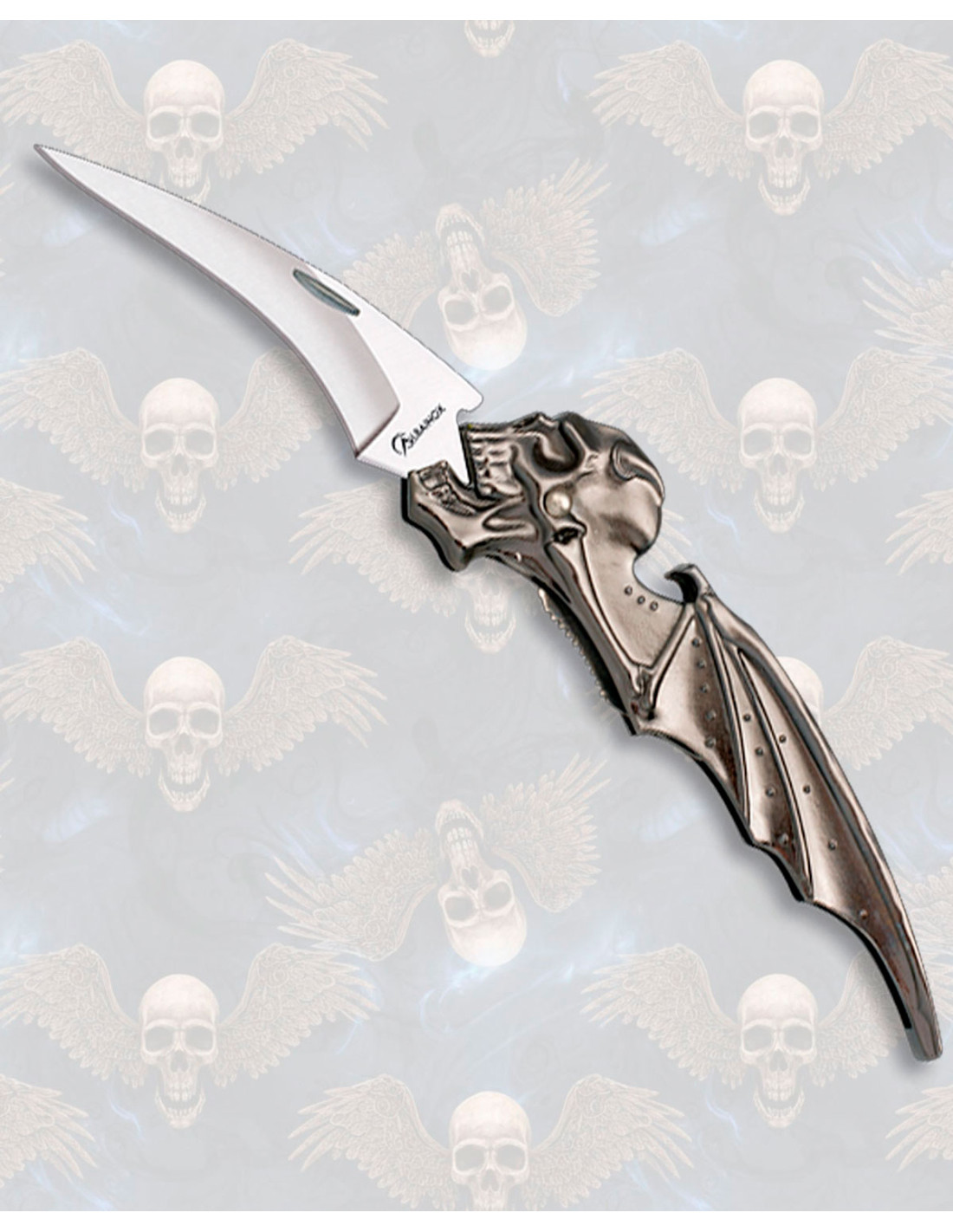 O punho é uma pequena escultura na mão, com uma caveira tridimensional que mantém mandíbula, dentes e buracos que parecem respirar história. As 'asas' que emergem do design, rebitadas e articuladas em aparência, somam textura e movimento visual, enquanto o acabamento metálico envelhecido do punho lhe confere aquele caráter rugoso e trabalhado que você busca para uma vitrina ou um presente com personalidade.