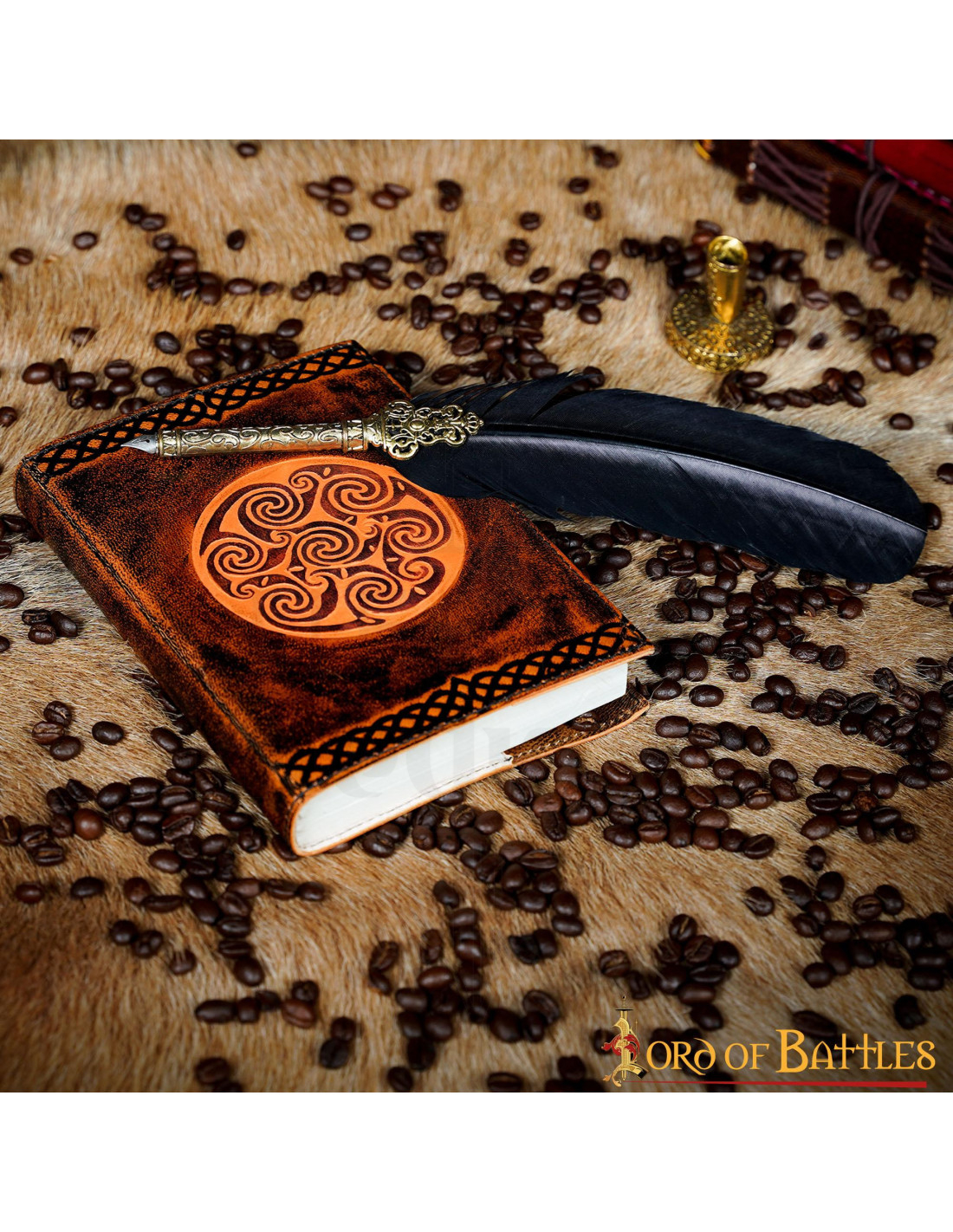 A capa de couro escuro, trabalhada com um acabamento envelhecido, traz uma presença acolhedora e robusta que transforma o cotidiano em algo especial. O adorno circular central, com um padrão de espirais entrelaçadas de design celta em tons de marrom e laranja, e as bordas decorativas superior e inferior, acrescentam um caráter artesanal que facilita conectar-se com suas ideias desde o primeiro traço.